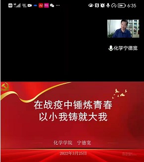 报告中,宁德宽同志对同学们提出三点希望。一、要有理性的判断,提高政治领悟力和政治判别力,要旗帜鲜明的反对境外势力对我们的污蔑和诋毁,要相信我们国家的抗疫方针和策略,要占据媒体制高点,做好正面宣传,齐心协力,共同战疫。二、要牢记使命,勇于创新,掌握过硬的专业技能,不断在实践中锤炼自己的毅力和品质,培养厚实的科学文化素质和家国情怀,将来报效祖国和人民。三、要发挥先锋模范带头作用,向英雄模范学习,在危险时候挺身而出,不怕牺牲,敢于斗争,在急难险重中体现出共产党员的先进本色!