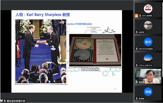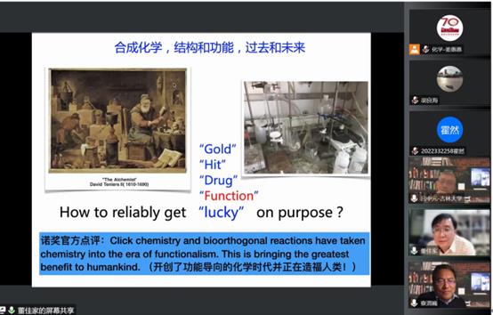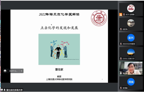 讲座中,董佳家教授围绕点击化学的发现和发展,深入浅出且幽默诙谐地介绍了 “点击化学”——模块化连接砌块分子,实现分子功能的理论本质,并对其开创了功能导向的化学时代进行了详细解读。同时分享了K. Barry Sharpless教授乐于学习、善于发现、勇于探索的科学精神以及Sharpless教授生活工作中的一些有趣的小故事。随后,董佳家教授激励广大学子,希望当代青年学者能够学习发扬老一辈化学家的科学精神,内化于心,外化于行,勇攀学术高峰。在交流互动环节,董佳家教授耐心详细地解答了院内外师生的问题,并对点击化学领域的发展做出了展望,伟德国际victor1946及其他院系200余名师生在线收看。