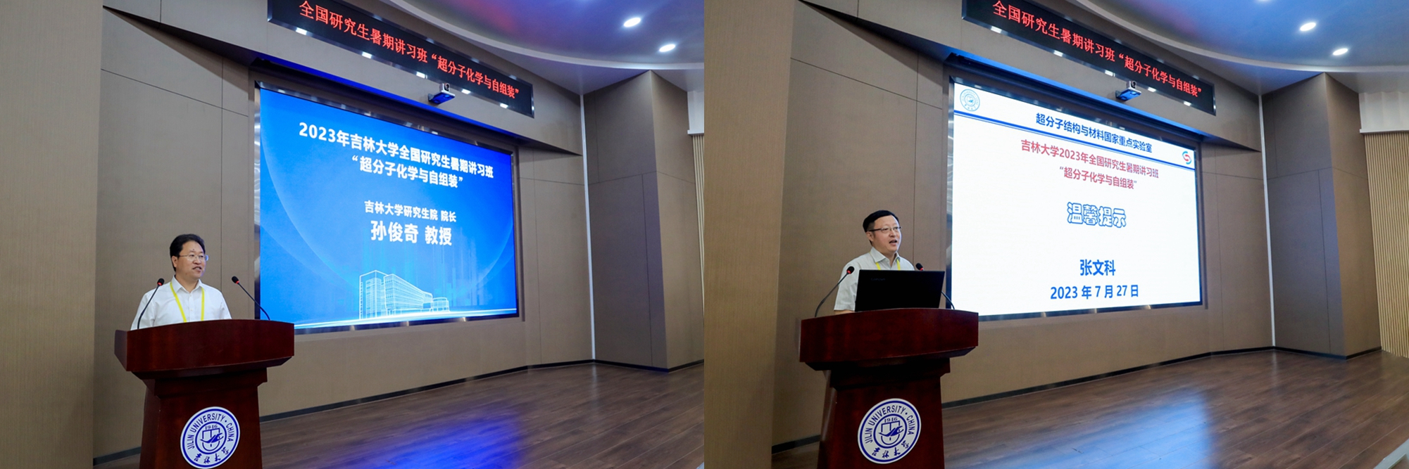 开班仪式上,研究生院经理、超分子结构与材料国家重点实验室主任孙俊奇代表组委会致辞,介绍了本次讲习班作为“东北六校”联合举办的重要学术交流活动之一的背景意义,并鼓励学员们不断开拓创新。超分子结构与材料国家重点实验室副主任张文科介绍了讲习班期间学员日常安排、校园基本情况,强调了学员纪律及相关安全要求。