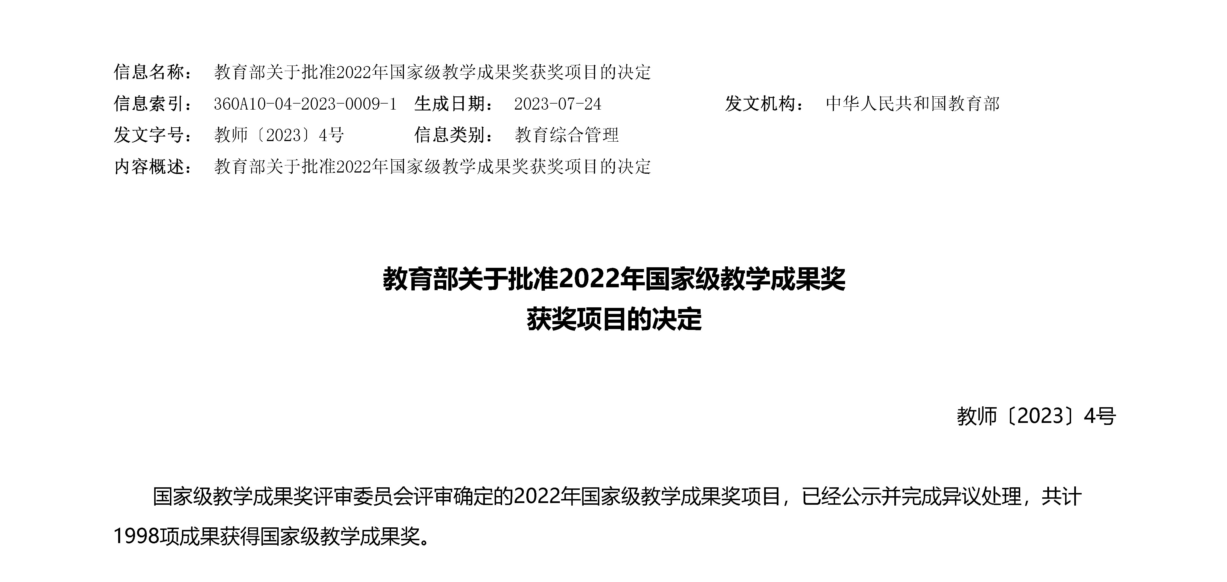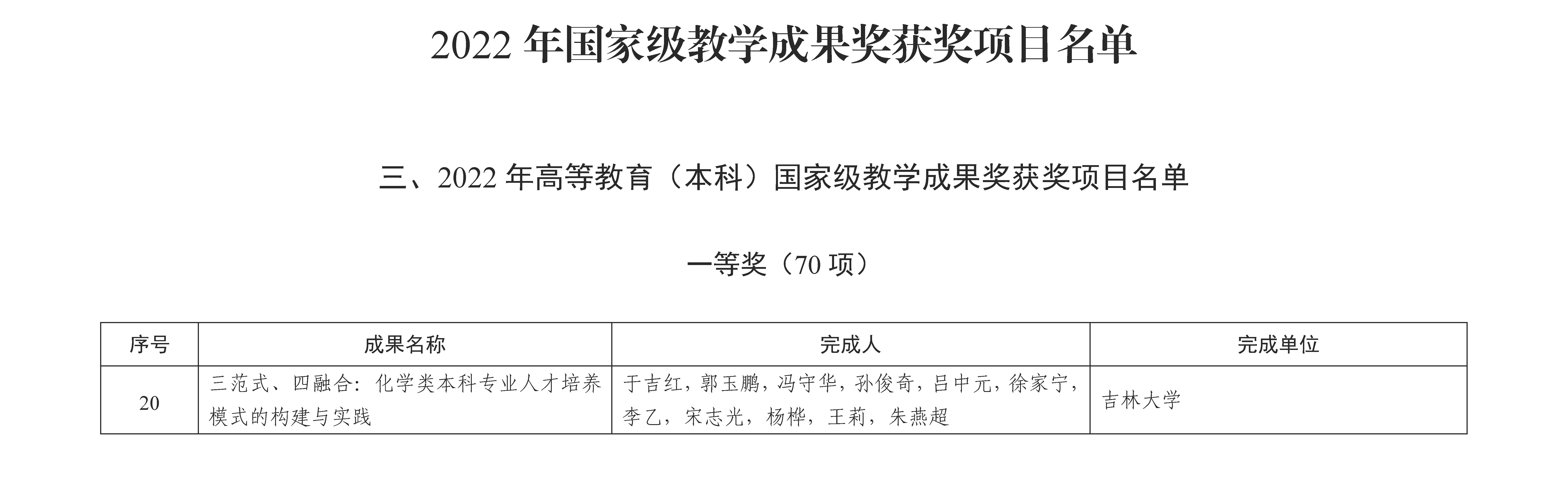 近日,《教育部关于批准2022年国家级教学成果奖获奖项目的决定》(教师〔2023〕4号)公布。伟德国际victor1946于吉红、郭玉鹏、冯守华、孙俊奇、吕中元、徐家宁、李乙、宋志光、杨桦、王莉、朱燕超完成的《三范式、四融合:化学类本科专业人才培养模式的构建与实践》教学成果,荣获2022年高等教育(本科)国家级教学成果奖一等奖。这是70项2022年高等教育(本科)国家级教学成果奖一等奖中唯一一项化学专业相关的教学成果,也是公司继1993年《物理化学团队建设与人才培养》获国家级优秀教学成果一等奖以来再次荣获国家级教学成果奖一等奖。