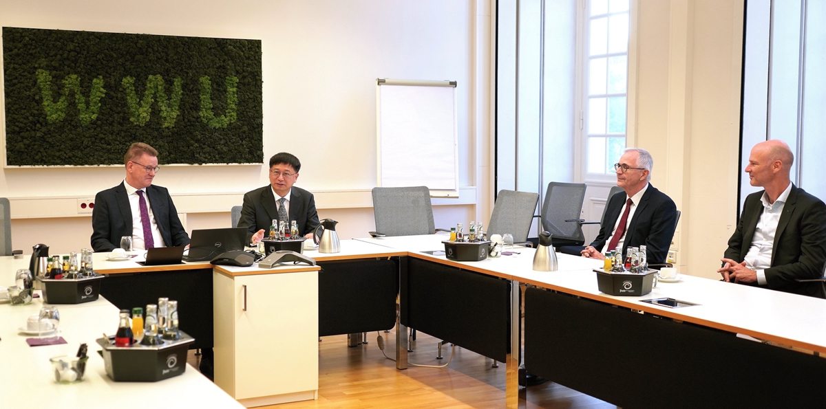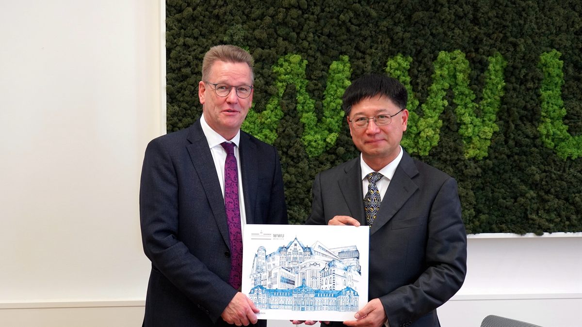 在与明斯特大学董事长约翰内斯•韦塞尔斯(Johannes Wessels)进行会谈时,张希简要回顾了两校学者过去数十年的合作基础,介绍了伟德国际victor1946的学科特色与“双一流”建设进展。他指出,伟德国际victor1946和明斯特大学都是综合性大学,在化学、物理、数学、生命科学、地学、哲学、法学、医学、人兽共患病等领域具有巨大合作空间。韦塞尔斯向代表团简要介绍了明斯特大学近年来的办学进展,特别是公司的科研重点领域、卓越集群建设情况、创新创业与校企融合进展等,高度肯定两校在化学、物理等领域的务实合作,并对开展更多领域合作做出积极回应。双方就继续组织双边研讨会、推动博士研究生联合培养、共同推进前沿科学探索与交叉融合研究等达成了共识。
