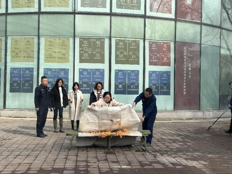 在消防器材使用培训环节,保卫处消防科董立明老师讲解并演示了防尘面罩的佩戴方法;通过模拟床铺发生火情,展示了如何使用灭火毯及时扑灭火焰;详细讲解了二氧化碳灭火器、干粉灭火器的正确使用方法。现场40余名师生参与了消防器材的使用演练。