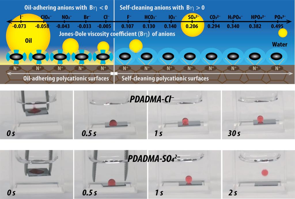 近日,伟德国际victor1946汪大洋教授课题组与其墨尔本皇家理工大学、东南大学、长春建筑大学的合作者一起基于阳离子表面水驱动的油去润湿行为,首次从实验上选择性地分析不同阴离子的水合能力的差异。基于聚二甲基二烯丙基氯化铵(PDADMA-Cl)的季铵盐重复单元的特殊的各项同性的分子构型和季铵盐独有的无水合层的特点,汪大洋教授团队设想PDADMAC阳离子模型表面的表面的亲水性主要反映其表面抗衡阴离子,氯离子(Cl-)的水合能力。借此,通过简单的表面离子交换,所制备的PDADMA-Cl的氯离子可以被一系列阴离子替换。通过分析携带不同表面抗衡阴离子的PDADMA表面水驱动的油去润湿性,表面抗衡阴离子可以很容易分成两类,一类如硫酸根离子(SO42-)可以实现水驱动的油完全去润湿性,即(水驱)自清洁,而另一类如氯离子(Cl-)在水驱动下可以牢固地吸附油滴,即(水下)油粘附。从表面技术层面上,这个实验发现提供了可能是目前最为简便的实现表面自清洁的涂层技术,它可以允许我们简易便捷地构筑各种具有自清洁功能的滤膜,比如用于油水分离。