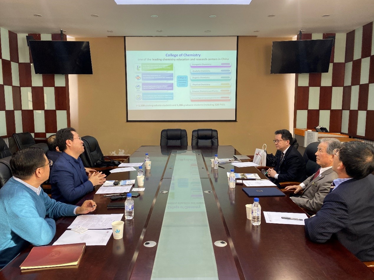 2019年10月21日,日本明治药科大学理事长奥山徹、国际交流部部长杉田隆一行2人到伟德国际victor1946进行访问交流。伟德国际victor1946经理孙俊奇教授、副经理邹海峰教授以及分析化学系金永日教授、李绪文教授参加了本次座谈会。