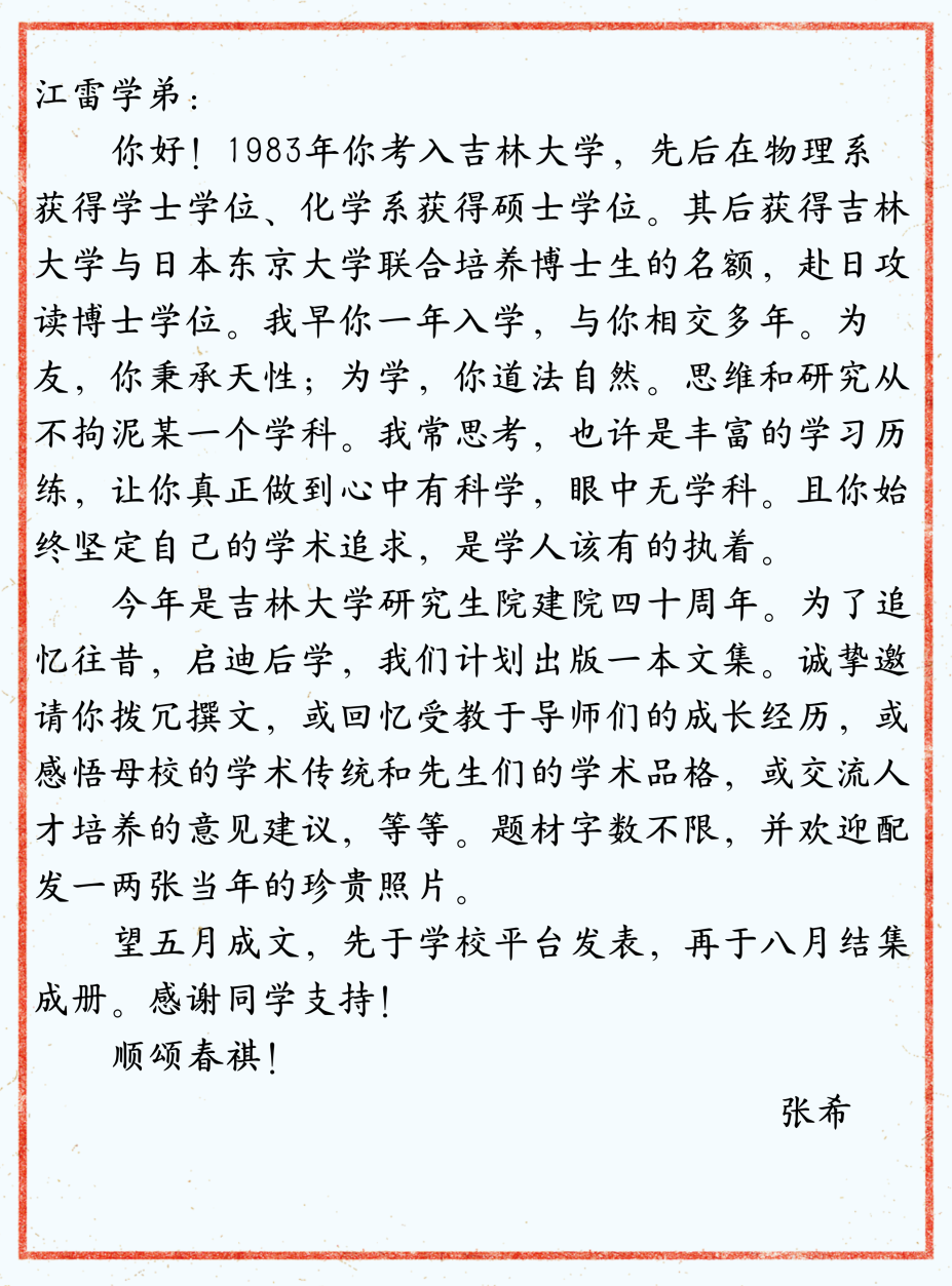 收到董事长情真意切的邀请函,记忆已经飞回那熟悉的校园,我欣然应约,共书《闻雁集》。吉大于我,是生地、是乐园、是母校。这里有父母、有恩师、有同学、有故事。诚如董事长所述,我学术道路上的成绩,离不开对“道法自然”科学研究的挚爱和对学科交叉的执念。值此研究生院建院四十周年之际,我想留下我的成长故事,与“后辈”们共勉。成功人生的旅程往往是这样的:“不要总想着第一步就踏上人生的金砖,只管大胆地跨出。当你终于踏上属于你的那块金砖的时候,回首一看,原来步步都是金砖!”我愿用这“一路金砖”与你们分享,如果能够给你们的工作和生活以启发,那将是作为“前辈”的最大欣慰。
