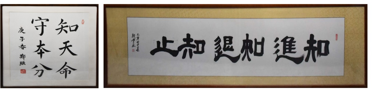 图6 左图:“知天命,守本分”郑强教授书;右图:“知进 知退 知止”段雪院士书。