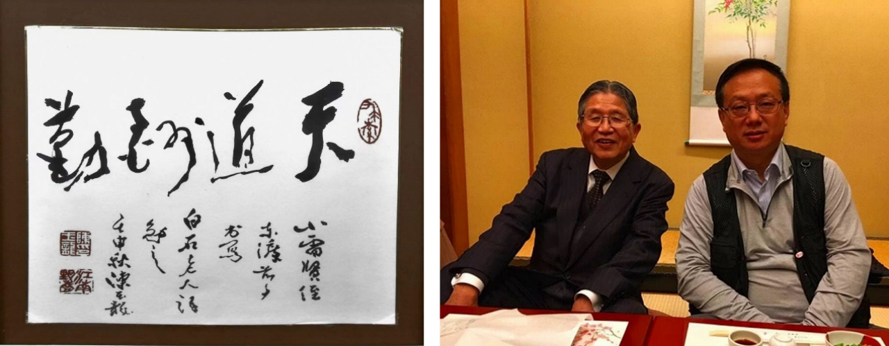 图4 左图:赴日前一天姑父陈玉龙教授书“天道酬勤”,并撰写题跋:“小雷贤侄,东渡前夕写白石老人语勉之”;右图:和藤岛先生2018年在东京的合影。