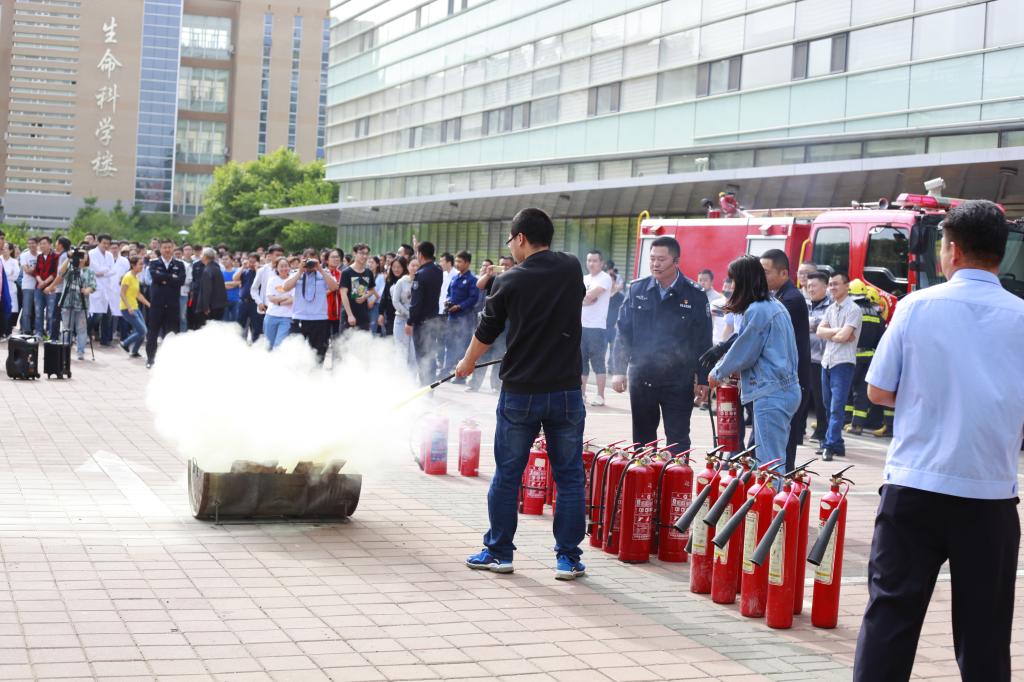 最后,在消防器材实物教学环节,董立明老师详细讲解并演示了干粉灭火器、二氧化碳灭火器、泡沫灭火器、水基灭火器、防火毯等消防器材,10余人次员工在保卫处老师的指导下参与上述消防器材的学习和使用;王俊大队长带领参加本次演练的消防官兵,在水罐消防车上模拟教学消防栓水带的连接和灭火技巧,使用举高喷射消防车演示消防车高空喷水灭火。