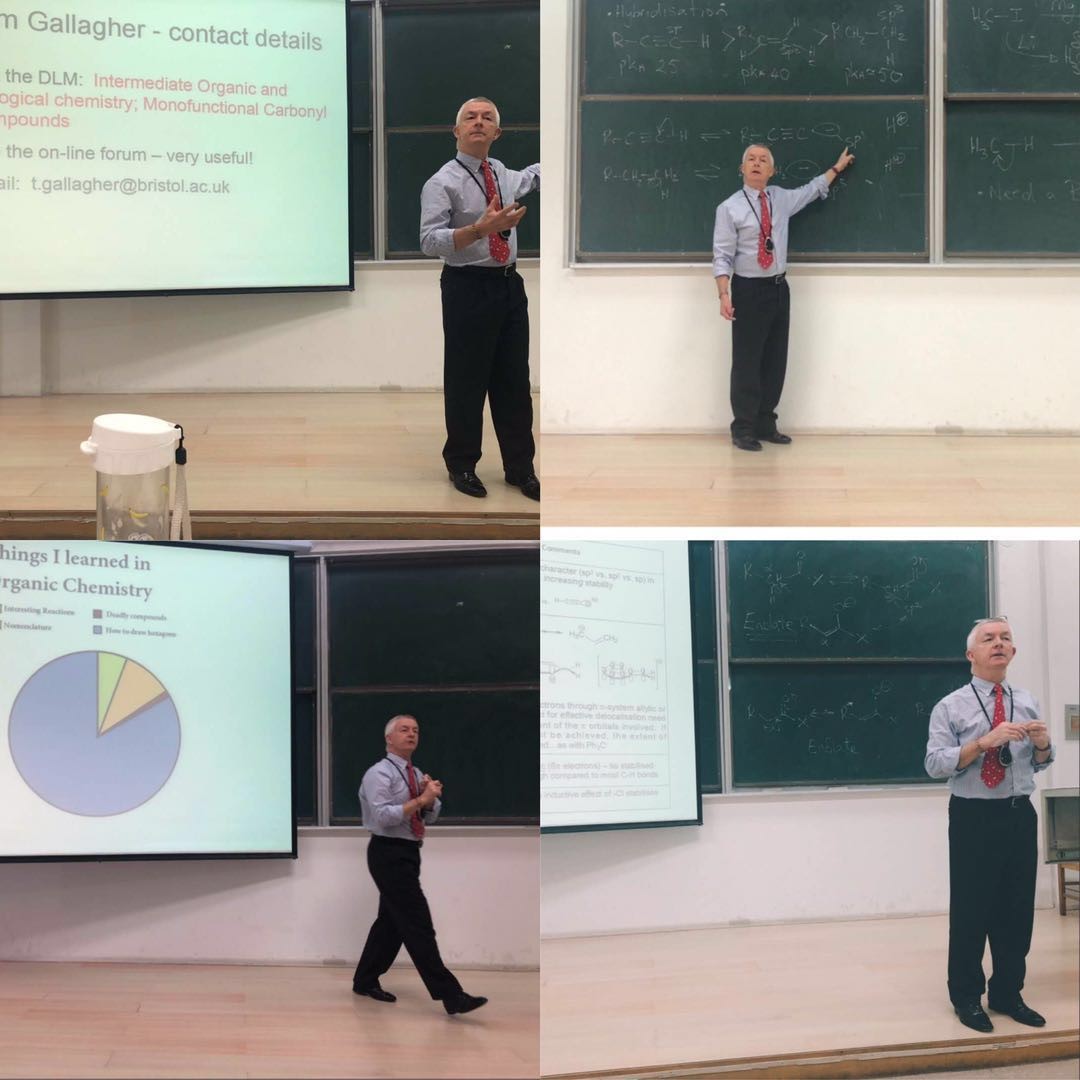 4月9日,受伟德国际victor1946邀请,布里斯托大学副董事长,前理学部学部长,有机化学教授Tim Gallagher以板书与PPT结合的讲授方式,为伟德国际victor194617级本科生化学专业的百余名同学讲授了一节有机化学课程, 内容涉及到碳负离子的性质及相关反应。
