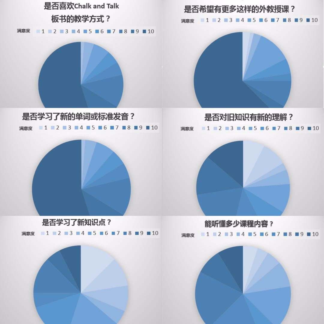 通过对员工课堂效果的问卷调查,结果显示有80名同学积极参与评价,反馈结果如下,其中80%的同学对板书式的教学方式表示非常满意(>8分);在专业英语和化学知识的吸收理解方面,也有一半以上的同学表示在这种全英授课的条件下,能够将专业知识和英语同步提高(>6分);并有70%以上的同学强烈希望(>8分)以后有更多这样的外教授课。