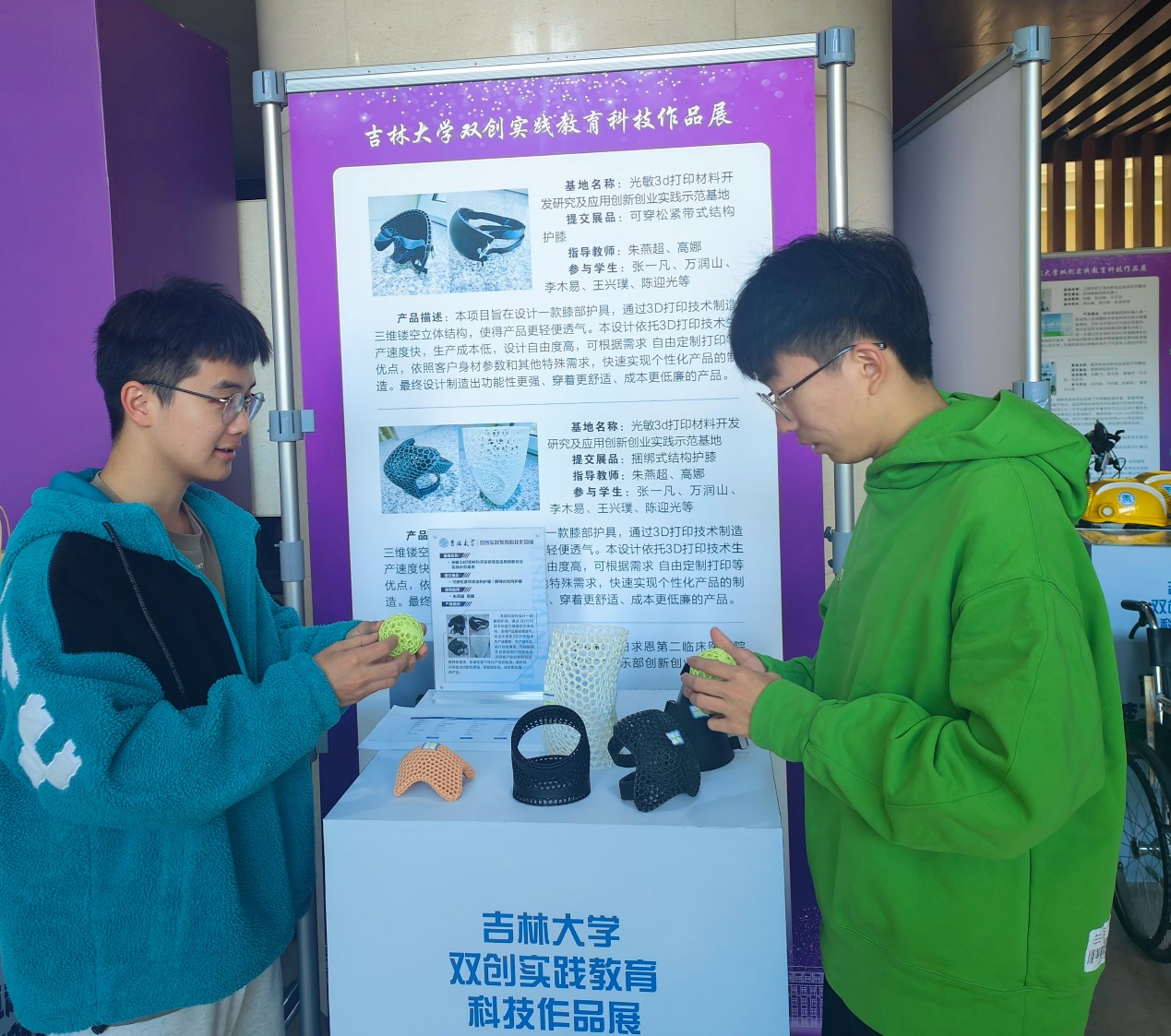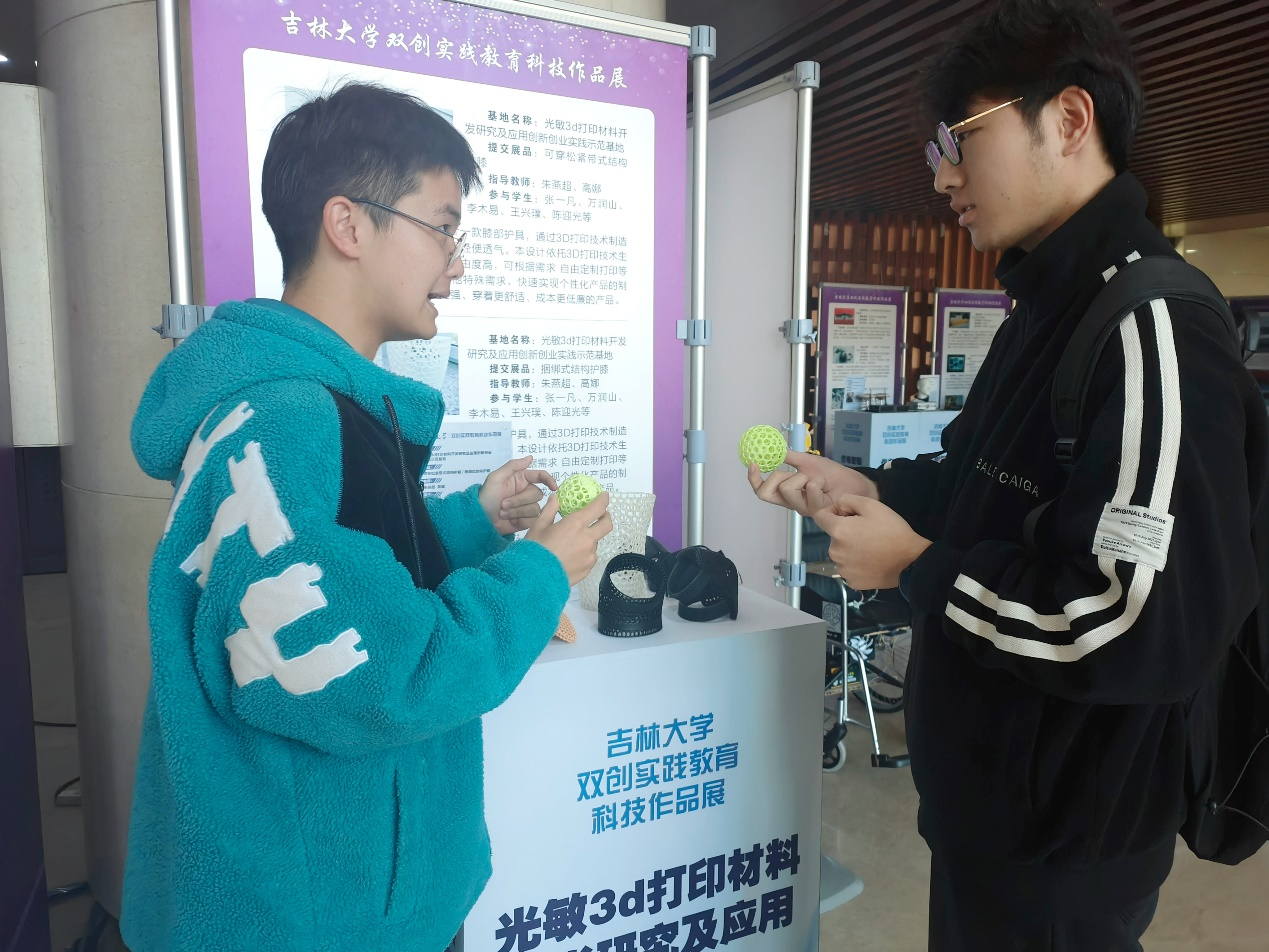 伟德国际victor1946光敏3d打印材料开发研究及应用创新创业实践示范基地在与苏州博理新材料科技有限公司合作的基础上设计制作的三维立体多孔结构护膝产品参与了本次展会,护膝可用于运动防护以及医疗辅助。2022级化学专业李木易同学为此次参展的讲解员。