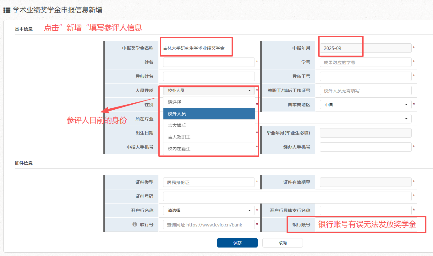 1. 使用个人邮箱账号登录“一张表”平台(https://one.jlu.edu.cn),在“研究生评奖评优管理”- “学术业绩奖学金申报信息”栏点【新增】进行申报人及银行卡信息填报。请申报人务必认真填写和核实银行卡等相关信息,确保准确无误,保证获奖者奖学金及时发放。已毕业研究生可由在校生帮忙代填。