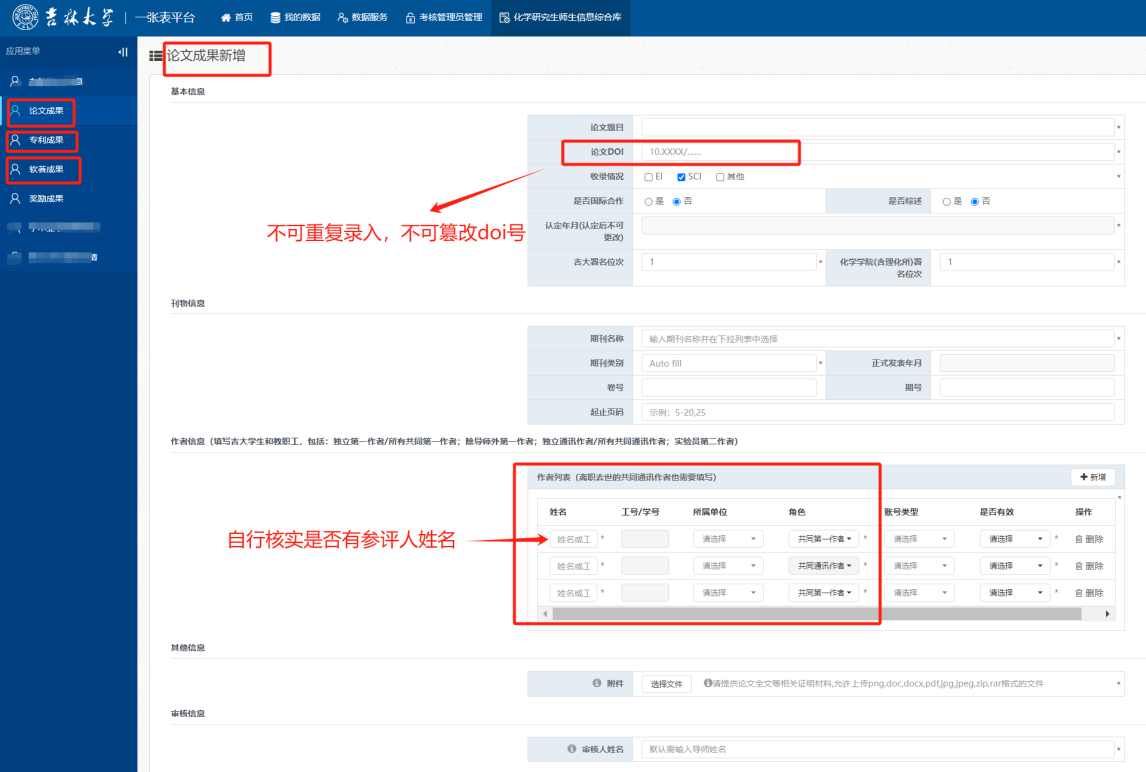 2.使用吉大校内邮箱账号登录“一张表”平台(https://one.jlu.edu.cn)录入相关的论文、专利、软著、奖励类成果,提交后由导师进行审核。录入“论文DOI”时,若提示“数据不可重复”,说明该成果已在数据库中,不可重复填写,可通过查询方式确认参评成果信息的完整性和准确性;提交成果时,存在省略其他共同第一或共同通讯作者、篡改作者排序、篡改论文DOI号重复录入成果等误导评审行为的,取消评奖评优资格;