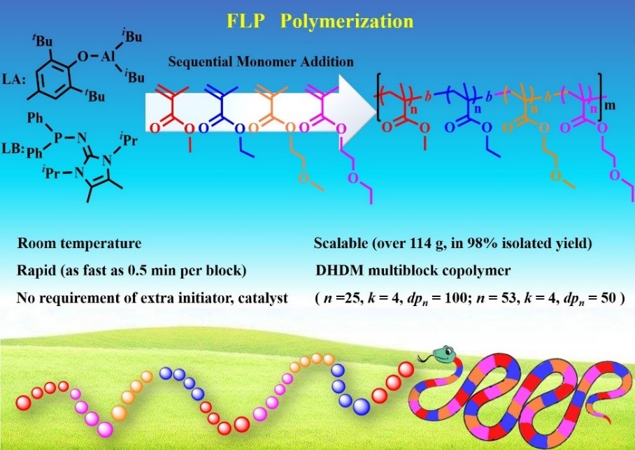 由于体系中同时存在没有被中和的Lewis酸和Lewis碱,“沮丧”Lewis酸碱对(FLP)可以催化许多特殊类型的反应。包括小分子有机反应和高分子合成等。伟德国际victor1946张越涛教授课题组一直致力于FLP催化高分子活性聚合的研究,并取得一系列开创性成果。最近,他们利用FLP活性聚合体系快速且大量地聚合甲基丙烯酸甲酯(MMA)等四种亲疏水性不同的单体,实现DHDM(double high (molecular weight anddpnvalue) and double multiple (monomers and block numbers))序列可控高分子的合成。得到了世界纪录级的53嵌段序列可控高分子(图),该记录比之前的提高了大约2.5倍。不仅如此,每一嵌段的dpn也由原来的10增加到50。真正的做到了双高和双多(DHDM)。该聚合体系简单易行,在室温下烧瓶中即可完成,除了在反应开始时需要加入催化体系外,其它的嵌段只需连续加入不同单体即可。体系不仅可以高产率的(>98%)实现百克级的放大实验,而且聚合速度也非常快。整个53段聚合只需要不到30分钟就可以合成得到一系列分子量可控且分子量分布较窄的序列可控高分子。上述特征展现了该体系具有非常好的工业化应用前景。