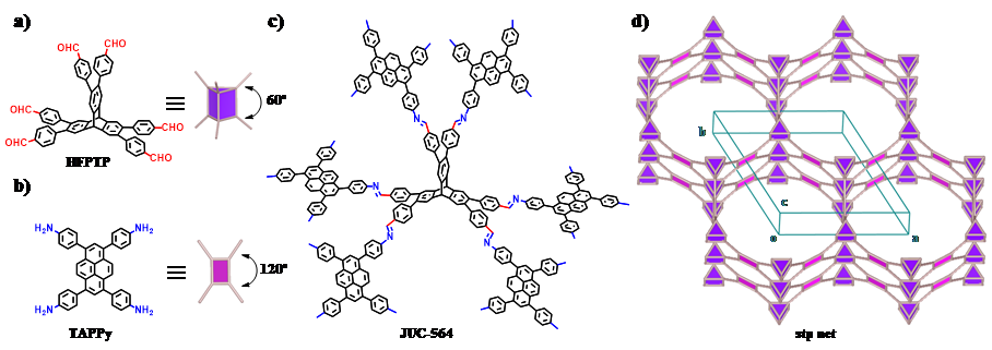 JUC-564的合成示意图:a)六连接单体HFPTP;b)四连接单体TAPPy;c) JUC-564结构;d) stp拓扑结构。