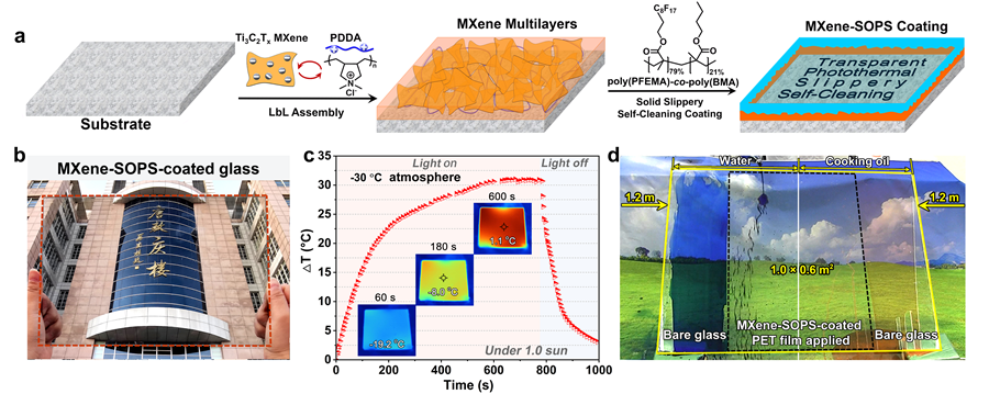 据此,伟德国际victor1946刘小孔教授研究团队设计并制备了一种高度透明的太阳光热抗/除冰涂层,该涂层对可见光的透明度高达77%,同时兼具自清洁、自修复、大面积制备等优异特性。这种涂层由超薄MXene多层膜与固态超滑自清洁表面(solid slippery self-cleaning surface)的结合构筑而成(图a,b)。得益于超薄MXene多层膜优异的光热转换性能,即使在环境温度为零下30 ℃的情况下,这种透明涂层在一个太阳光强照射下,也能够将表面温度提高31 ℃,有效阻止水的结冰或将先前形成的冰进行融化(图c)。同时,涂层的固态超滑表面赋予了其极佳的自清洁性能,能够有效抵抗水性及油性污渍(图d),可使没有冻结的水或融化的冰快速滑落而不留痕,实现太阳光照下高效抗冰或除冰的性能。该涂层具有在光照下实现自修复的性能,可以对抗物理损伤和化学氧化,降低维护成本并且延长使用寿命。这一具有高透明度与自清洁性能的太阳光热抗/除冰涂层有望在汽车挡风玻璃、建筑物玻璃幕墙、风力发电轮、太阳能发电板、飞机涂层等领域得到广泛应用。