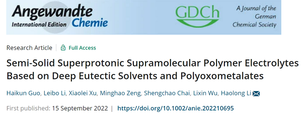 近日,伟德国际victor1946李昊龙教授通过采用多金属氧酸盐(POM)纳米团簇作为超分子交联剂来固化深共晶溶剂(DES),以制备半固态块状超分子聚合物电解质材料。研究显示,POMs提供的丰富质子和强氢键使这些SP材料成为具有足够机械强度的超质子导电电解质,其在室温下表现出超过1×10-4 S cm-1的质子电导率和超过1 MPa的断裂强度。此外,超分子聚合物电解质的热力学可逆性使它们能够在温和加热时通过简单的熔体渗透策略形成稳定的电极-电解质界面,从而提高超级电容器的性能。总体而言,这项工作提出了一种创新的DES/POM混合系统,是开发用于能源和电子应用的功能性超分子材料有前景的平台。