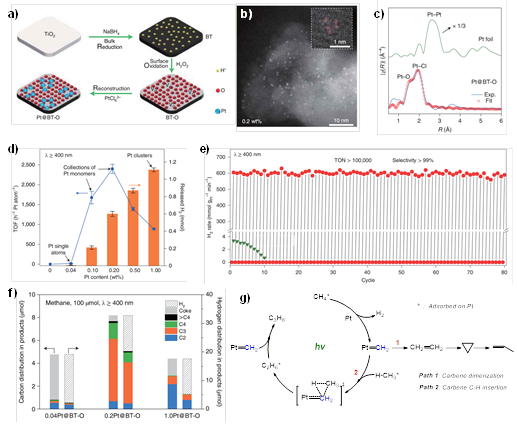图:a)“还原-氧化-重构”策略制备了“单原子Pt集合”修饰的黑色二氧化钛光催化剂;b)球差电镜照片;c)X射线吸收光谱;d)可见光催化环己烷无氧脱氢测试;e)循环稳定性测试;f)可见光催化甲烷无氧脱氢测试;g)推测的反应机理。