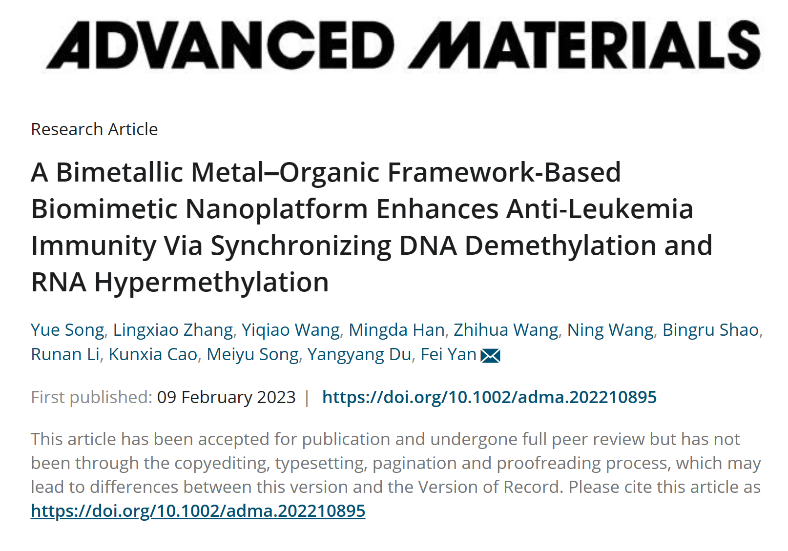 近日,伟德国际victor1946无机合成与制备化学国家重点实验室闫飞课题组提出一种纳米表观治疗新策略,并以“A Bimetallic Metal–Organic Framework-Based Biomimetic Nanoplatform Enhances Anti-Leukemia Immunity via Synchronizing DNA Demethylation and RNA Hypermethylation”为题发表在Advanced Materials上。伟德国际victor1946无机化学专业2020级在读硕士研究生宋岳为该论文的第一作者。