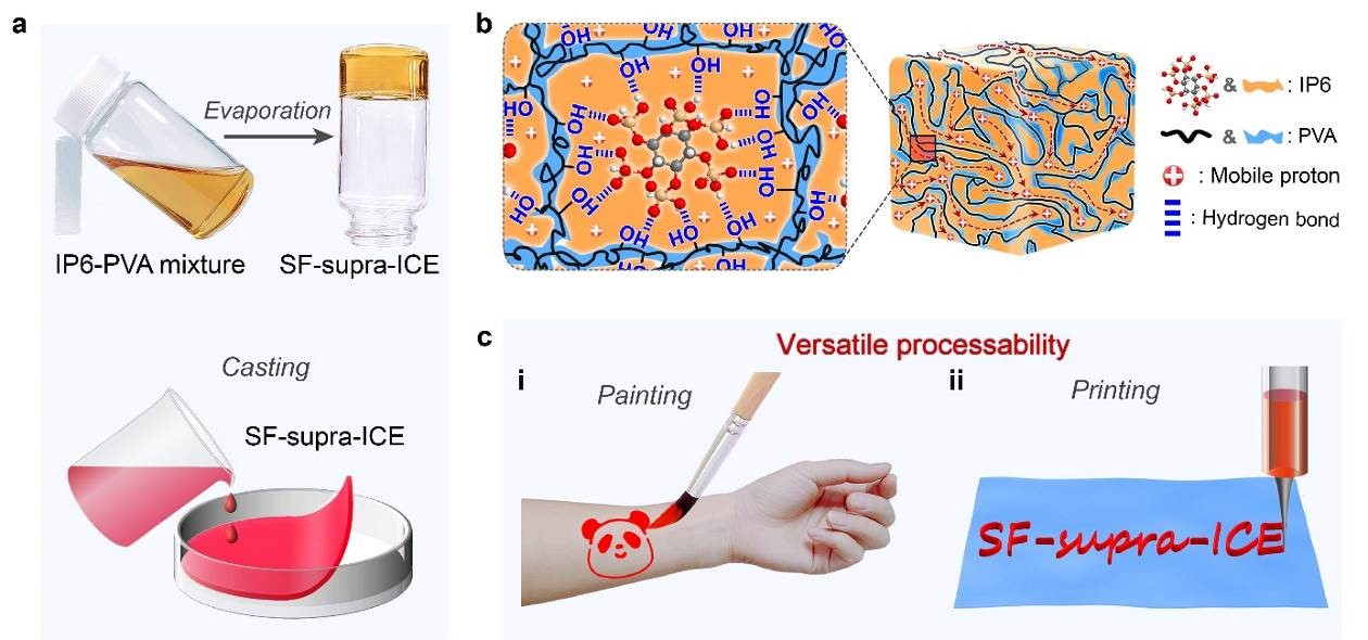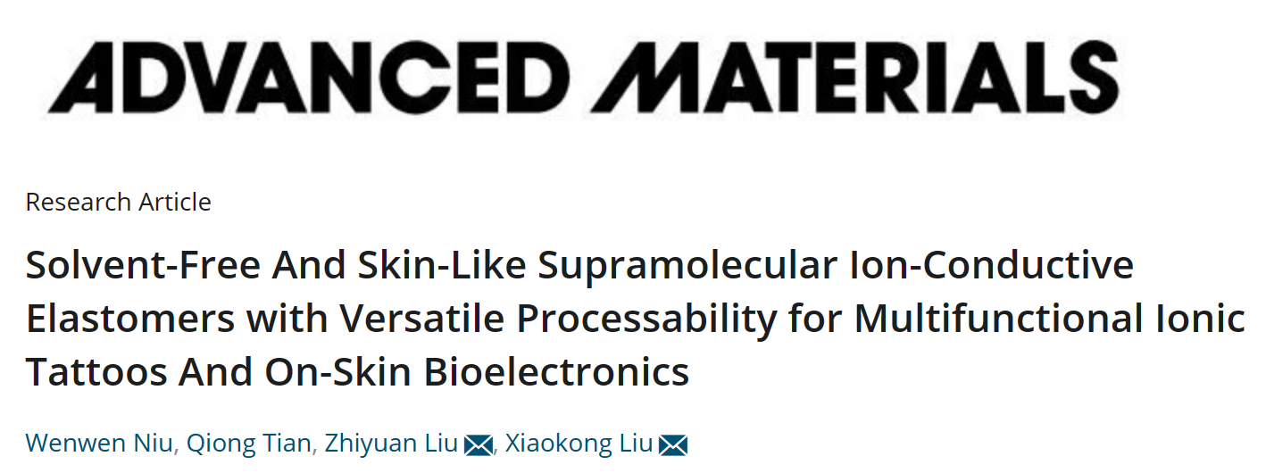 伟德国际victor1946刘小孔教授课题组和深圳先进院刘志远研究员合作提出了超分子封装的理念,利用生物相容性的PVA通过高密度氢键交联对可电离的天然无毒小分子IP6进行封装,发展了兼具服役稳定性与生物安全性的无溶剂超分子离子导电弹性体(solvent-free supramolecular ion-conductive elastomer,SF-supra-ICE)。该弹性体的室温离子电导率高达3.3×10-2S m-1,具有类似皮肤的柔韧性、回弹性和应变诱导硬化特性,同时还具有高透明度、透气性、自粘附性。SF-supra-ICE的制备极为简便,仅由前驱体水溶液经一步自发的水蒸发过程即可得到,可进行多样化的加工成型。将SF-supra-ICE的前驱体溶液作为墨水,通过涂抹、绘制、打印等方式可在人体皮肤上构筑个性化的“离子纹身(I-tattoos)”,进而构建多功能的皮肤电子器件,用于人体电生理信号采集监测、人机交互、精准诊疗等领域。该工作以题为“Solvent-Free and Skin-Like Supramolecular Ion-Conductive Elastomers with Versatile Processability for Multifunctional Ionic Tattoos and on-Skin Bioelectronics”的文章发表于Advanced Materials上。
