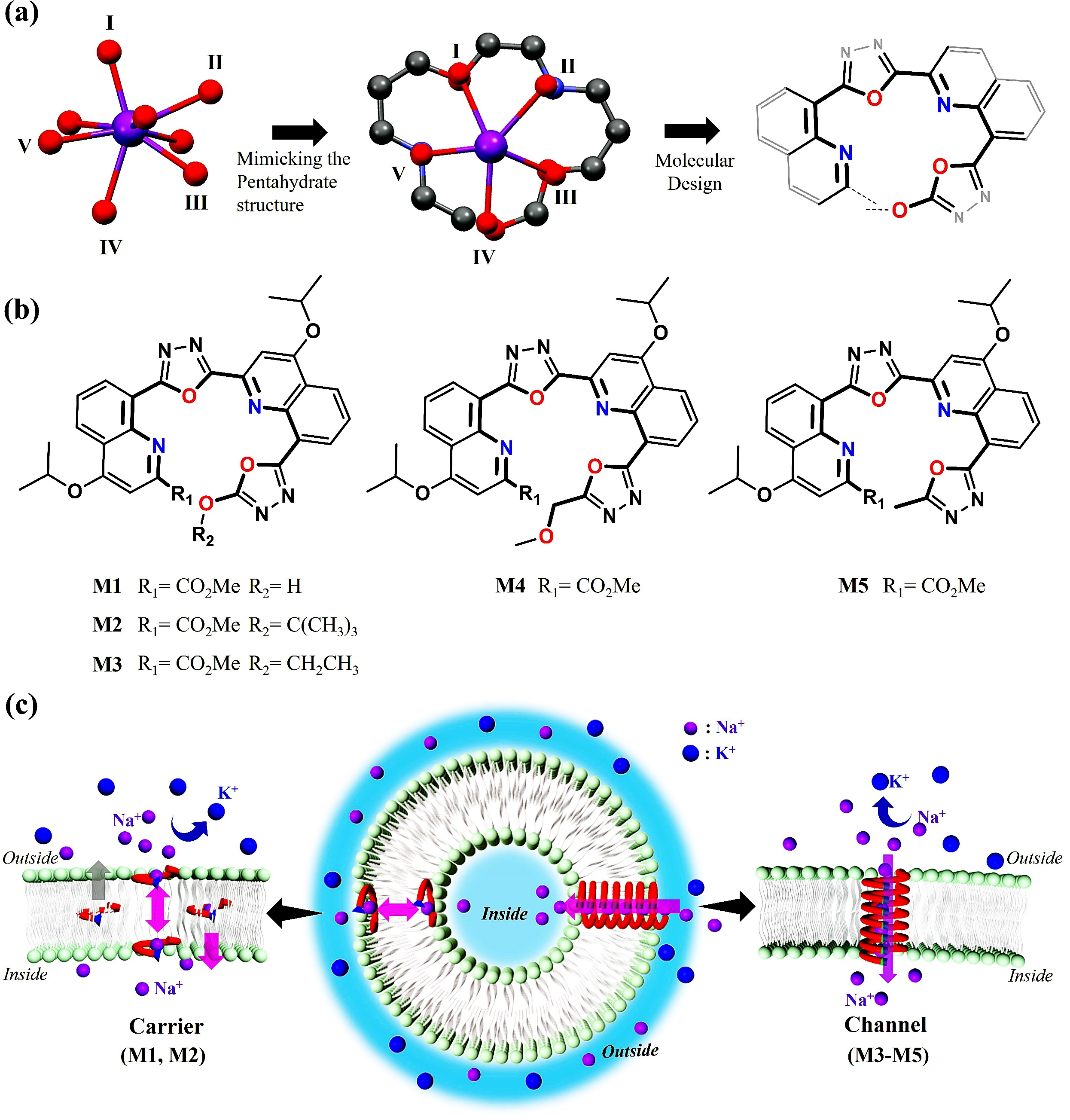 图1. (a)水合钠离子晶体结构以及模拟五水合配位结构的分子设计;(b)五种纳米孔的分子结构;(c)含纳米孔的螺旋分子以通道或离子载体方式传输钠离子示意图。