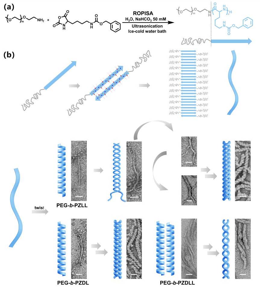 针对这个难题,伟德国际victor1946陈学思院士、孙静教授课题组借鉴天然蛋白质可自发形成高度有序多级手性超分子结构,率先提出了在超声辅助条件下,采用大分子引发剂mPEG-NH2引发ε-苄氧羰基-L/D-赖氨酸N-羧基内酸酐(ZLL-NCA/ZDL-NCA)单体在水相中开环聚合诱导自组装(ROPISA),在数分钟内高效制备了多级手性超螺旋结构,进一步诱导等摩尔外消旋单体实现立体选择性聚合,合成了具有较高立构规整度的聚肽高分子。该工作以题为“Fast Catalyst-Free Synthesis of Stereoselective Polypeptides via Hierarchical Chiral Assembly”的文章发表在Journal of the American Chemical Society 上。