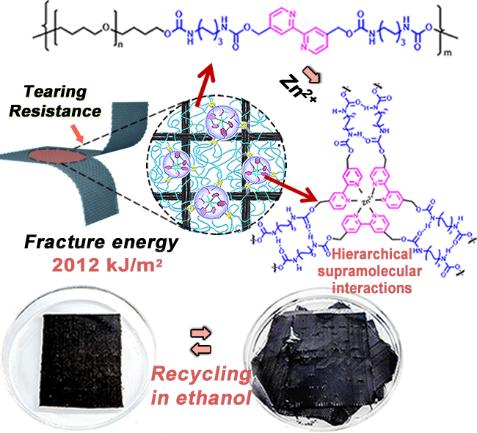 由于碳纤维增强树脂基复合材料(CFRPs)具有轻质高强的优势,在交通运输、装备制造、安全防护、风力发电等领域的作用越发重要。该材料产量持续增长,已成为不可或缺的关键战略材料。CFPPs 通常由碳纤维布与环氧树脂等热固性塑料复合而成。这些热固性塑料可以固定碳纤维的取向结构,使CFRPs 呈现高强特性,但也导致了CFRPs 缺乏柔性、抗撕裂能力差。因此,现有的CFRPs 通常难以满足软体机器人、个人防护设备等新兴领域对柔性高强碳纤维复合材料的需求。此外,塑料粘合剂的热固性还导致CFRPs 难以拆解和回收,引起的资源浪费和环境污染问题也受到人们的极大关注。因而,亟须采用新的设计理念,开发能与碳纤维牢固粘附的可回收弹性体粘合剂,以制备可循环利用的柔性复合材料。而满足上述需求的弹性体粘合剂不仅需具备高力学强度和韧性,以维持柔性CFRPs 的力学强度;还需同时具有较低的模量和高的能量耗散能力,以确保外力在CFRPs 中的大面积传导并被高效耗散,从而赋予柔性CFRPs 优异的抗撕裂能力。在一个弹性体中同时集成高粘附性、高力学强度、低弹性模量、高韧性和高抗撕裂能力仍然面临巨大挑战,因为这些性能通常相互排斥。