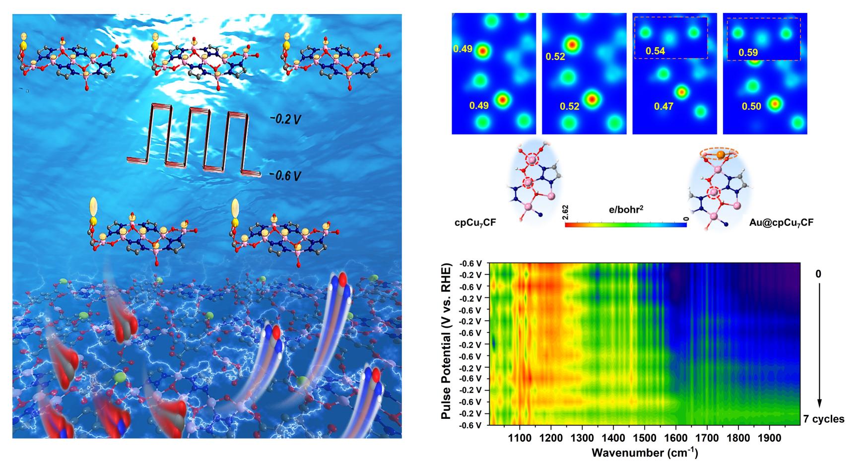 针对上述问题,伟德国际victor1946苏忠民教授/刘靖尧教授、华南师范大学兰亚乾教授团队合作构建了一个动态系统,能够精确控制催化位点的电荷密度分布,从而调节电合成尿素的多个连续步骤,实现高效的尿素合成。研究者们将Au 原子嵌入到共面的Cu7II簇基三维框架中(Au@cpCu₇ CF),打破了原始cpCu₇ CF 的电荷对称性。在动态条件下,随着脉冲电位在−0.2 V 和−0.6 V(相对于可逆氢电极)之间切换,Au@cpCu₇ CF 中Au 和Cu 原子之间的不对称电荷分布程度发生了周期性的动态变化。这种动态可控的电荷振荡能够调节电合成尿素中的多个连续步骤。理论计算结果表明,Au@cpCu₇ CF 的表面电荷密度对施加的电位具有强的响应性。当电位切换至−0.6 V 时,具有高电荷密度的Au 原子增强了对*HNO₂ 和*NH₂ 中间体的吸附,从而抑制了副产物生成路径;在−0.2 V 的低电位下,Au 和Cu 原子位点之间的电荷分布促进了热力学C–N 耦合。研究人员探讨了不对称电荷分布的动态调控在尿素电合成中的重要作用,为未来动态电催化研究提供了参考。相关研究成果近期发表在了Adv. Mater.杂志(Adv. Mater. 2024, 2408510)。