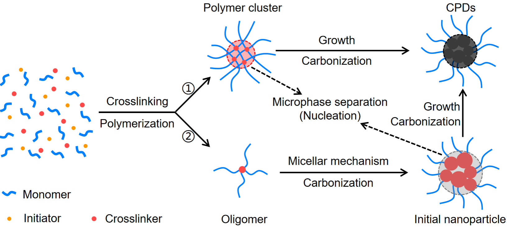 碳化聚合物点(carbonized polymer dots, CPDs)作为一种零维碳基纳米材料,具有聚合物/碳杂化结构,与石墨烯量子点和碳量子点不同,其不仅展现出碳基光电纳米材料的优越性能,而且具有聚合物特性。CPDs的聚合物特性为其带来了更大优势和应用潜力,近年来CPDs被广泛研究,通过水热、溶剂热、微波辅等过程已合成了种类和性能繁丰的CPDs。然而,大部分报道都聚焦在其构效关系、功能及应用上,而对CPDs形成机制的研究则较为空白,为数不多的探索是通过改变反应时间或温度来观察中间产物的变化进而给出其可能的形成过程。此外,由于高温、高压下的化学反应非常复杂,并且缺乏对封闭合成环境的原位监测技术,这给研究CPDs的形成机制带来了很大困难。由于形成机制等基础问题的研究不够深入,对CPDs结构和性能调控也面临阻碍。到目前为止,CPDs的结构和尺寸可控合成仍然困难。因此,探索CPDs形成机制将为其结构设计和性能调控提供理论依据。