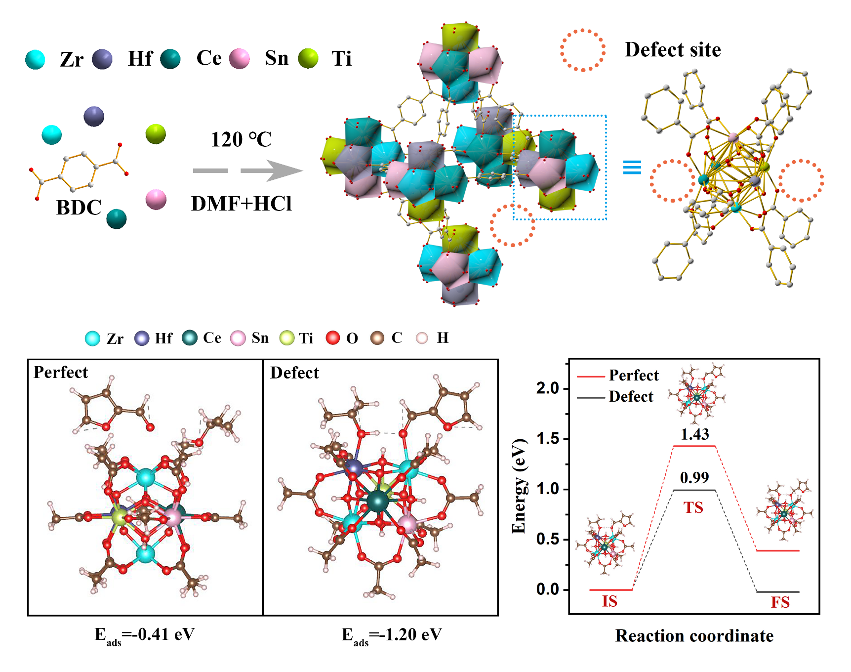 伟德国际victor1946田戈副教授课题组首次合成了高熵、缺陷丰富且粒径较小(32 nm)的UiO-66型MOF(ZrHfCeSnTi HE-UiO-66),并通过增加构型熵提高其对多种金属离子掺杂的耐受性。该高熵材料的晶格畸变导致金属节点暴露度显著增加,从而生成了配位不饱和金属位点,浓度达到322.4 μmol/g,显著提高了路易斯酸碱位点的丰富性,进而提升了其在催化转移加氢(CTH)反应中的催化性能。实验结果和理论计算都证实了配位不饱和位点的存在有效地调节了HE-UiO-66的电子结构,增强了其与底物分子的相互作用和结合,有效降低了氢转移过程的能量势垒。同位素标记质谱法证实了CTH反应路径。构象熵的增加促进了HE-UiO-66的物理化学性质(尺寸、稳定性、缺陷、配位不饱和位点和路易斯酸碱性质)的改善。该研究为构建MOFs中的配位不饱和金属位点提供了一种新策略,为MOF材料功能化的扩展提供了前景。相关研究成果发表在Nat.Comm.杂志(Nat.Commun.2025, 16, 367)。