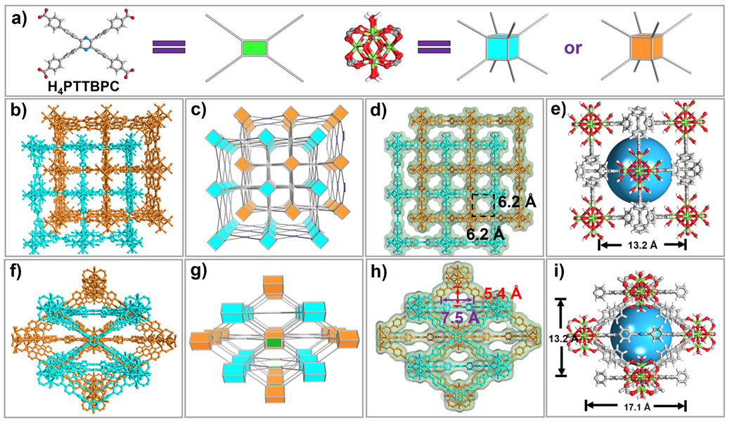设计和合成具有良好光捕获和光激发性能的金属有机骨架(MOFs)材料用于人工光催化CO2还原是一项有吸引力但具有挑战性的任务。该研究首次提出了设计合成一种新型聚集诱导发光(AIE)活性配体四苯基吡嗪(PTTBPC),通过与稳定的Zr-oxo团簇配位构建了Zr-MOF光催化剂(命名为Zr-PTTBPC)。Zr-PTTBPC具有双重互穿框架的scu拓扑结构,在水、各种有机溶剂和酸碱溶液中表现出优异的稳定性,同时具有良好的CO2吸附能力。其中PTTBPC配体具有强光捕获和光激发能力,而Zr-oxo团簇有利于CO2的吸附和活化,为进一步的金属改性提供了潜在的位点。因此,Zr-PTTBPC及其Co/Ni衍生物不仅表现出优异的稳定性和高CO2吸附能力(273 K和1 atm下73 cm3g-1),而且在420 nm LED光照下,Co修饰的Zr/CO-PTTBPC的CO产率高达293.2 µmol g h-1,可重复使用至少三个循环。通过电荷载流子动力学和理论计算的深入研究,揭示了其潜在的机制,证实了单相多组分协同作用是光催化CO2还原的关键。