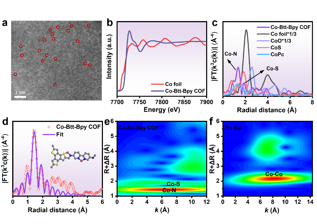 Co-Btt-Bpy COF的球差电子显微镜显示出高度分散的亮点,表明Co-Btt-Bpy COF骨架内存在Co单原子。此外,通过X射线吸收近边结构和扩展X射线吸收精细结构光谱确定了Co单原子的分散和配位环境。Co-Btt-Bpy COF的扩展边吸收光谱显示该COF中存在与钴酞菁(Co-N)和CoS(Co-S)相似的特征峰,但未检测到Co-Co峰,再次表明Co原子完全分散。Co K 边 EXAFS 的曲线拟合给出Co-N和 Co-S键在距离1.94 Å和2.23 Å处的配位数分别为1.62和0.44,并与我们预期结构相吻合。所以,Co-Btt-Bpy COF中Co单原子具有两种化学配位环境,即N-Co-N 和 N-Co-S(图二)。