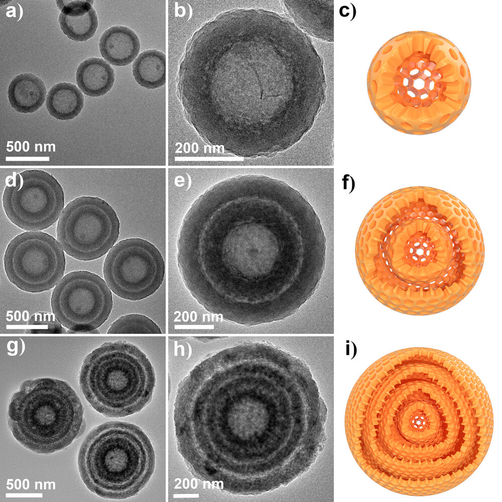 基于上述生长机制,可以通过调整交替的COP/COF层数来控制多壳COF粒子中的壳数。随着局部非晶/结晶界面数量的增加,获得了中空单壳结构COF颗粒(1S-COF HoMS,图3a-c)、中空双壳结构COF颗粒(2S-COF HoMS,图3d-f)和中空四壳结构COF颗粒(4S-COF HoMS,图3g-i)。高倍率TEM图像显示,所有nS-COF HoMSs中的每个壳都表现出均匀的壳层厚度。