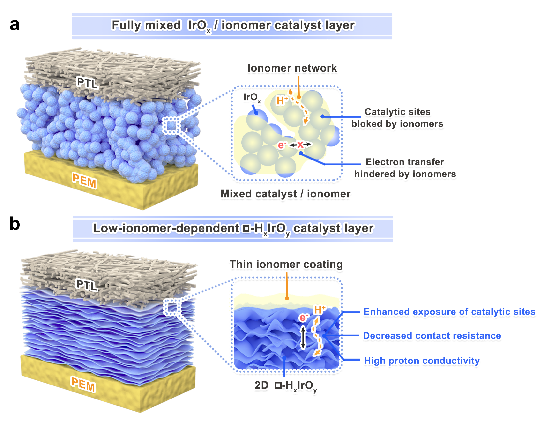 在PEM电解槽中,阳极催化层需同时具备析氧催化、电子传导和质子传导三大功能,以保障析氧反应的高效进行。传统催化层采用IrO2纳米颗粒与离聚物混合的结构,其中IrO2形成电子导电网络并提供催化活性位点,离聚物则作为粘合剂固定催化剂并构建质子传输通道(图1a)。然而,电绝缘性的离聚物会覆盖活性位点并阻碍电子传输。这意味着,优化膜电极性能不仅需要提升催化剂本征活性,还需要改进催化层结构设计。基于此,在本研究中,邹晓新教授团队设计制备了兼具析氧催化与质子传导双功能的层状铱基氧化物*-HxIrOy,通过催化剂的双功能集成,降低了膜电极催化层对离聚物质子传导功能的依赖,实现了铱原子利用率的提升和膜电极三相界面优化(图1b)。