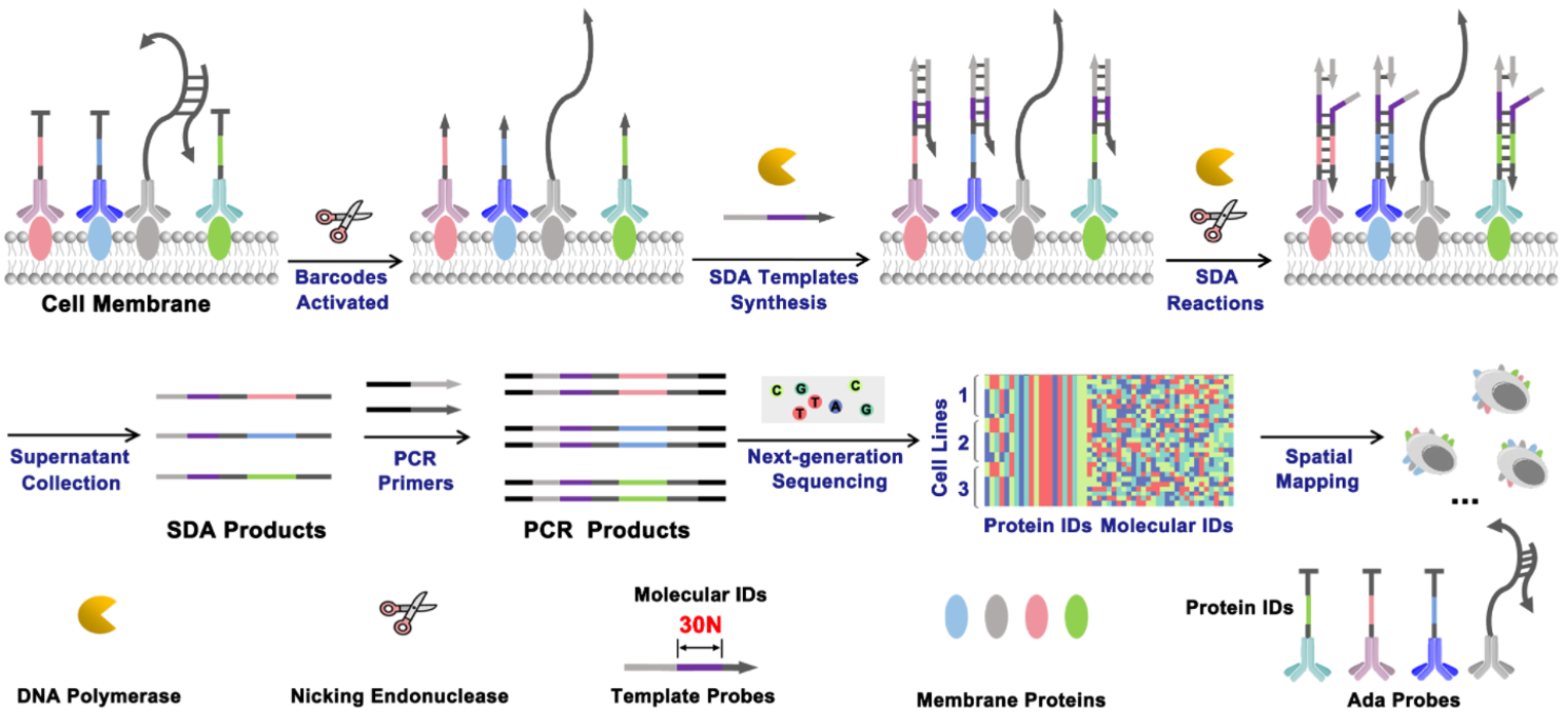 近日,伟德国际victor1946宋大千教授团队的孙颖教授与西安交通大学赵永席教授团队在复杂细胞纳米环境的蛋白质相互作用分析中取得重要进展。细胞结构的维持和功能调节在很大程度上取决于许多膜蛋白的组成和空间分布。然而,目前的方法在空间覆盖和数据可扩展性方面存在局限性,阻碍了对复杂细胞纳米环境中蛋白质相互作用的全面分析。针对上述挑战,团队提出邻近激活DNA扫描测序技术(Proximity-Activated DNA Scanning Encoded sequencing,PADSE-seq),将大规模的蛋白质邻近信息转换为DNA条码信息,实现了十种以上膜蛋白邻近位置关系的纳米尺度分析。相关成果以“Proximity-Activated DNA Scanning Encoded Sequencing for Massive Access to Membrane Proteins Nanoscale Organization” 为题,于4月11日发表于Proceedings of the National Academy of Sciences of the United States of America上。