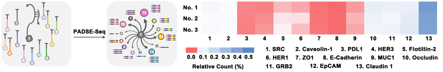 PADSE-seq技术在赵永席教授课题组之前工作CELL-TALKING方法(于2021年发表在Nature Communications)的基础上,引入链置换扩增反应,将邻近条码与分子条码串联,而后通过聚合酶链式反应与二代测序技术对结果进行解析。该方法将长度可调的柔性DNA动态探针固定在一端,使其可以在纳米范围内自由摆动而不受路径限制,从而在随机方向上对各种邻近蛋白进行全局扫描和信息记录。PADSE-seq通过单链DNA的自主循环切割,顺序激活分布在整个局部区域的编码探针。该过程引发链置换扩增反应和双向延伸反应,将蛋白质条码与分子条码串联连接,并进一步产生数百万到数十亿个嵌入组合标识符的扩增子,用于二代测序分析(图1)。通过PADSE-seq,实现了对乳腺癌细胞系中HER2蛋白周围的十余种邻近蛋白分布的全面分析(图2)。