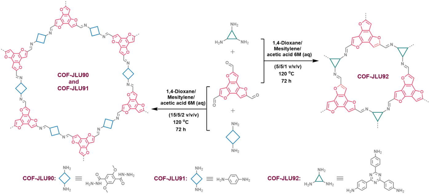 通过DFT理论计算和实验分析,揭示了三种共价有机框架材料(COF-JLU90、91、92)在光催化过氧化氢生产中的性能差异的内在机制。理论计算表明,COF-JLU90的腙键结构使最高占据晶体轨道(HOCO)与最低未占据轨道(LUCO)沿a/b轴角平分线方向呈现显著周期性分离,有效抑制光生电子-空穴复合,而亚胺键的COF-JLU91则无此现象。态密度分析显示COF-JLU90和92的价带边缘C-pz轨道权重更高,且载流子有效质量排序为COF-JLU92 < JLU90 < JLU91,表明其载流子迁移率更优。实验方面,COF-JLU90因一维纳米通道内密集排列的N-H基团与水分子形成氢键网络,表现出超亲水性(水接触角为0°)、高质子传导率(活化能仅0.96 eV)及优异水吸附能力,显著促进质子耦合电子转移(PCET)过程,理论计算也进一步验证了这一点。这些特性协同优化了水氧化(WOR)和氧还原(ORR)半反应的动力学,使其光催化产H₂O₂效率得到提升。研究还指出,通过调节连接基团和构筑单元可定向调控COFs的电子结构与表面亲水性,进而优化光催化性能。