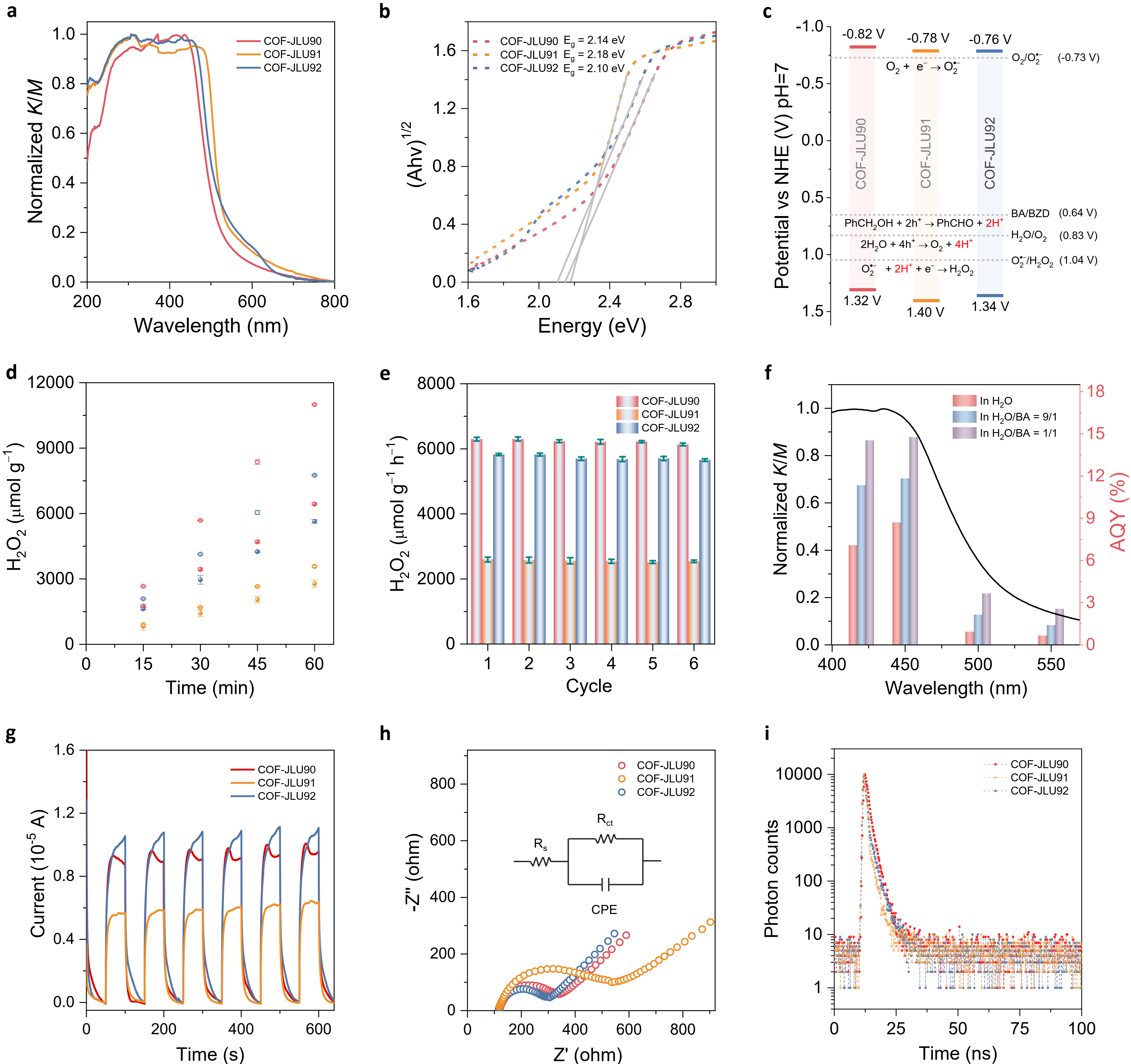 该研究系统评估了三种苯并三呋喃基共价有机框架(COF-JLU90、91、92)的光催化合成H₂O₂的性能。实验结果显示:COF-JLU90在模拟太阳光(AM 1.5G)下表现出最优异的光催化活性,H₂O₂速率达6432 µmol g⁻¹h⁻¹,在强光(λ>300 nm, 200 mW cm⁻²)下提升至10999 µmol g⁻¹h⁻¹。当在低质量浓度时速率可达9800 µmol g⁻¹h⁻¹,显著优于同类材料及传统催化剂(如g-C₃N₄、TiO₂)。研究其性能优势与适宜的光学带隙、导带位置以及高结晶度框架促进的电荷分离效率息息相关。电化学与光谱分析表明,COF-JLU90和JLU92具有更低的激子结合能(29.6-37.1 meV)和更长的载流子寿命(1.44-1.51 ns),有效抑制电荷复合。此外,三者均展现出色循环稳定性(6次循环活性保持>97%)和最高的表观量子产率,其中COF-JLU90的太阳能-化学转化效率达1.52%。研究进一步揭示质子耦合电子转移过程(PCET)与骨架亲水性/电荷传输特性的协同作用机制,为设计高效光催化剂提供了重要依据。