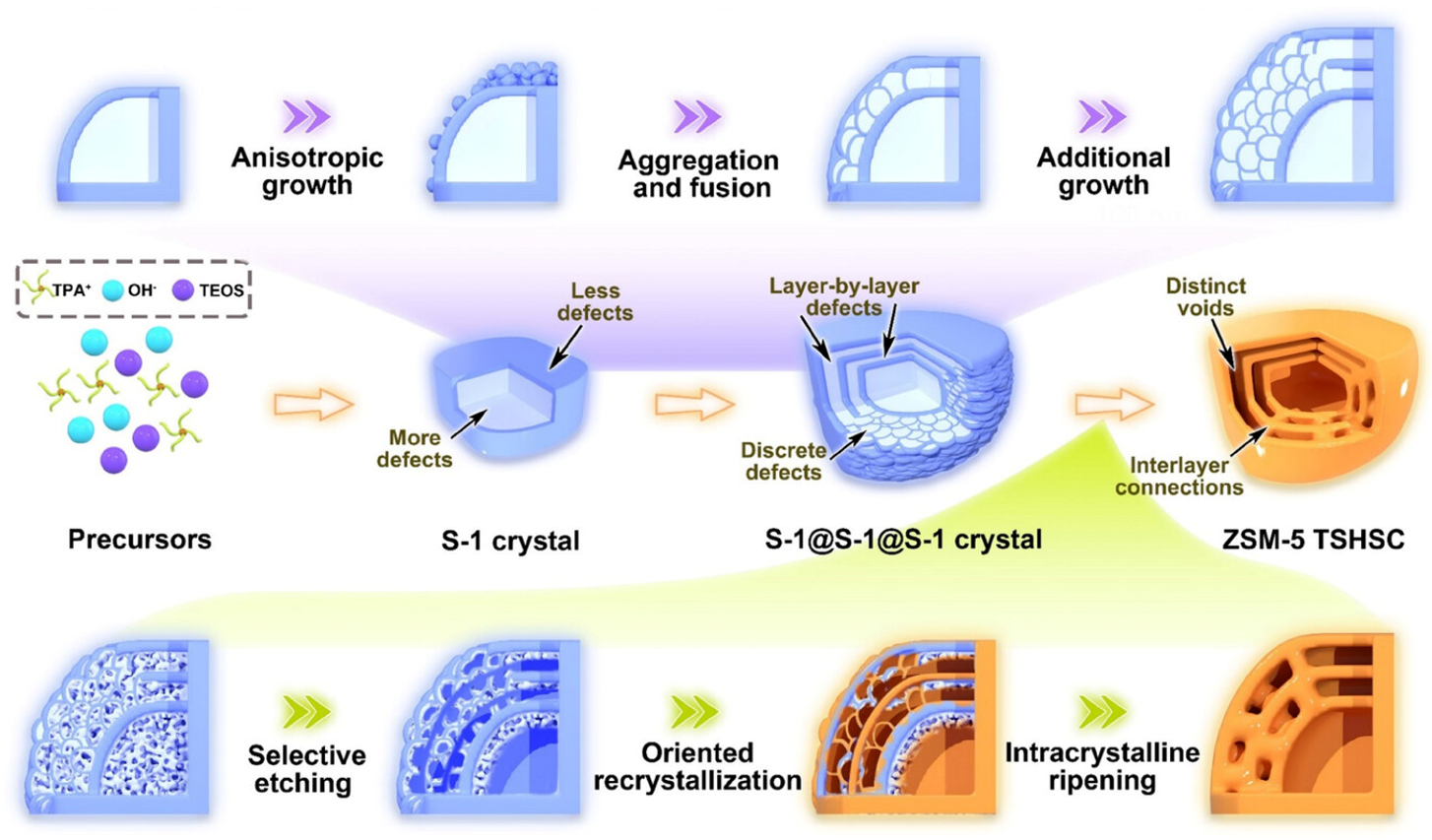 鉴于此,本研究提出了一种缺陷导向的定向动力学转化策略,成功制备出了单晶多层中空ZSM-5分子筛(图一)。首先,在纯硅分子筛(Silicalite-1)内核表面连续逐层外延生长,得到具有梯度缺陷分布的外壳。由于分子筛晶体不同取向的生长速率差异,形成了梯度的层状缺陷和离散的岛状缺陷。在碱性水热条件下,缺陷密集区域优先被刻蚀形成介孔或空腔。同时,有机结构导向剂诱导硅铝物种发生重结晶,使得纳米壳层间相互连接,维持了单晶结构(图二)。