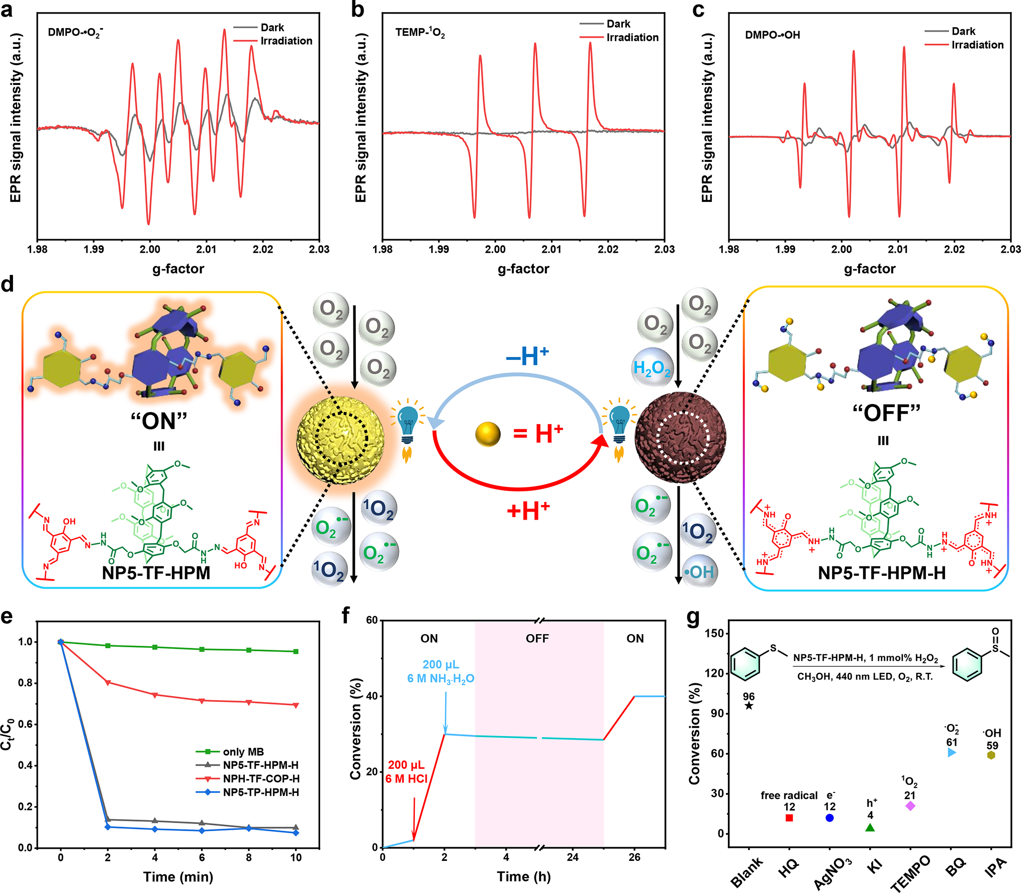 得益于富电子空腔,智能光催化剂NP5-TF-HPM展现出独特的质子响应性,可通过质子诱导实现从烯醇-亚胺到酮-胺形式的结构重排。此特性进一步调节了材料的光生活性氧能力。在保留NP5-TF-HPM光催化产生的活性氧物种的同时,NP5-TF-HPM-H还具备类过氧化物酶活性,能够高效生成羟基自由基(图2)。