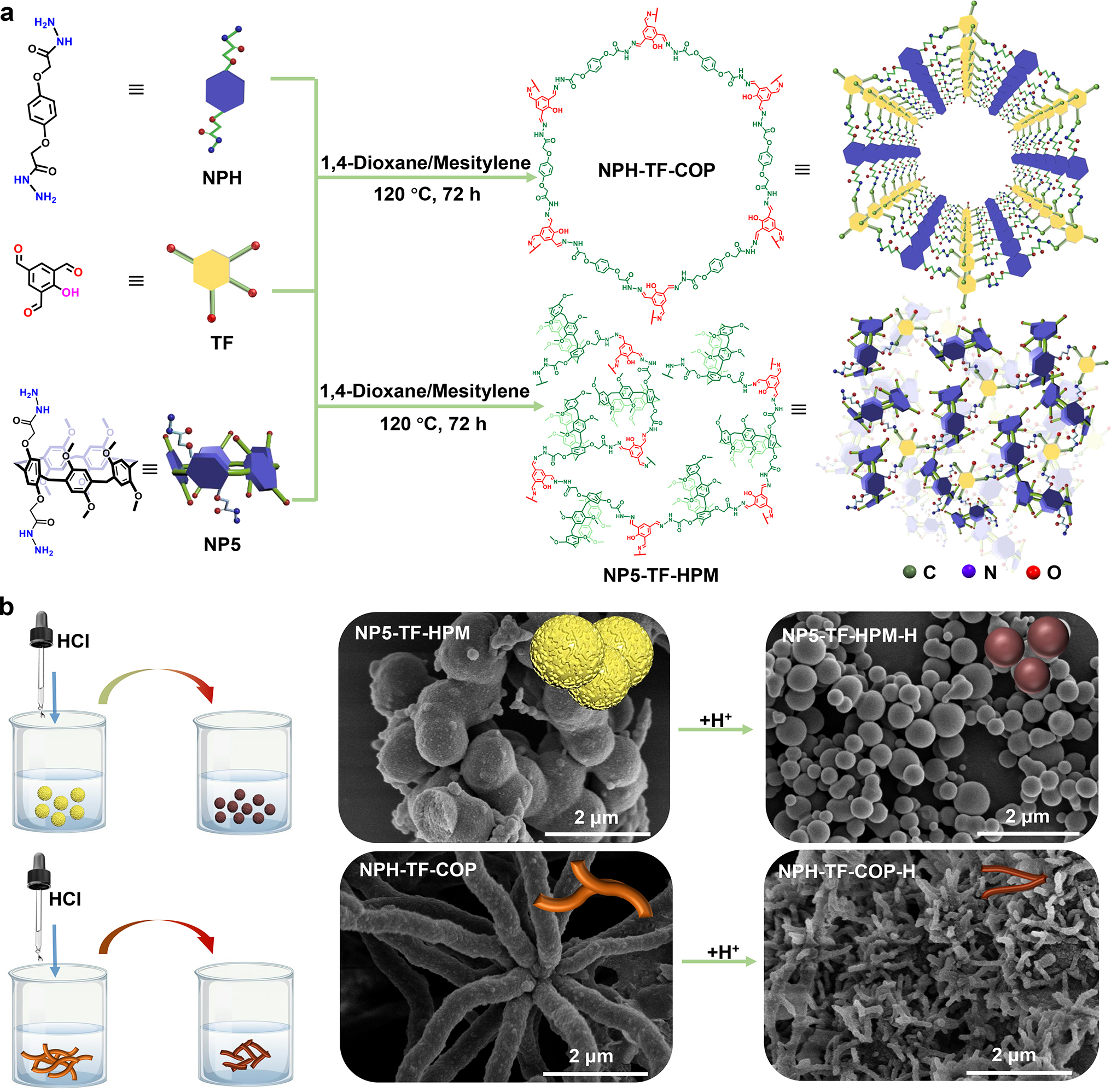 近日,伟德国际victor1946杨英威教授课题组联合张志权教授团队,在利用柱芳烃基共价有机微球进行可控高效光催化氧化方面取得重要进展。该团队巧妙地利用柱芳烃的空腔特性,提出了一种刺激响应的智能光催化剂合成策略(NP5-TF-HPM和NP5-TF-HPM-H,图1),实现了活性氧的按需扩增,从而能够精准高效地光氧化降解有毒硫化物。该项研究将分子层面的响应性转化为宏观系统应用,为复杂的光催化领域带来了进展,并有望推动超分子材料和智能材料在环境适应性技术领域的应用。相关研究成果以“Proton-Mediated ROS Amplification in Hydrazone-Linked Pillararene Microspheres for Photocatalysis”为题,于4月28日发表在Nano Letters期刊上。