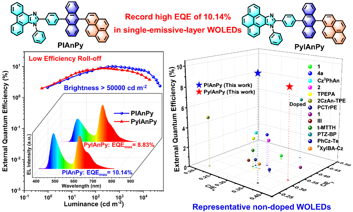 白光的色坐标位于色品图中心点(0.33, 0.33),发射范围为400-700 nm。设计单分子白光材料需要采用两种以上生色团,调谐长、短波长的发射,使光谱尽量覆盖整个可见光区。近来,伟德国际victor1946路萍教授团队和华南理工大学乔现锋教授团队合成了一系列基于芳基并咪唑、蒽和芘基团的热激子材料。研究发现,在PIAnPy和PyPIAnPy两个材料中,由于蒽和芘等刚性稠环芳烃(PAHs)的大π共轭平面结构,在固体状态下通过分子间强的相互作用形成了面对面的分子堆积结构,产生了激基缔合物发光,结合芳基并咪唑基团的蓝光短波长发射,二者协同作用使固态下的发射光谱几乎覆盖整个可见光范围,得到了高效率单分子白光材料。
