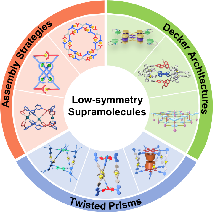 受自然界的启发,超分子化学家设计并合成了一系列结构精美、功能多样的超分子结构。值得注意的是,目前已发展的超分子体系以高度对称结构为主。然而,具有特殊局部微环境的低对称结构在生命体系中扮演着重要角色。例如,具有低对称性特点的血红蛋白由四个不对称的亚基组成,确保了氧的结合、释放和运输调节。同样,胰蛋白酶活性中心氨基酸残基的不对称排列决定了它能够识别并作用于特定的肽键序列,从而确保了蛋白水解反应过程中的高催化选择性。相比于高度对称的超分子结构,低对称性超分子结构具有更少的对称元素(对称中心、对称轴和对称面),表现出特定的空腔、结合位点和结构多样性,对于特异性识别同分异构体和催化反应具有重要意义。