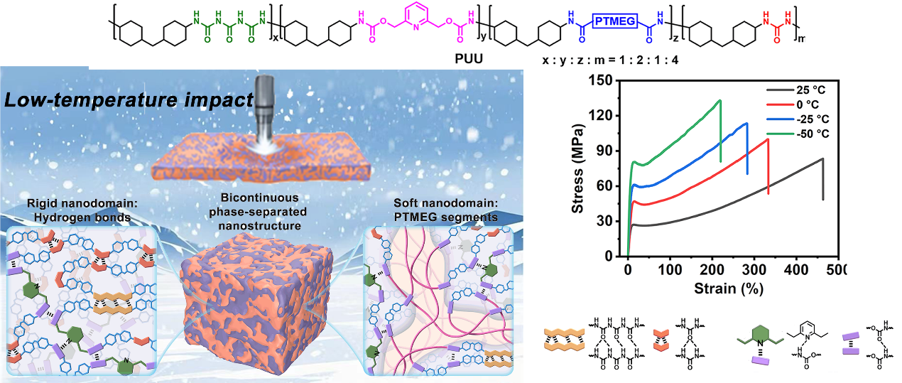 最近,伟德国际victor1946孙俊奇教授课题组通过可逆交联策略,利用不同结合能的氢键及其聚集体交联柔性聚四氢呋喃(PTMEG)链段,成功制备了一种在极低温度下具有卓越抗冲击性能和柔韧性的高强度聚氨酯-脲(PUU)塑料。PUU塑料通过尿素、2,6-吡啶二甲醇、羟基封端的PTMEG、水(H₂O)与二环己基甲烷-4,4'-二异氰酸酯(HMDI)之间的缩合聚合反应合成。PUU中含有三缩脲、脲基、氨基甲酸酯、吡啶等基团,它们能够形成单重、二重或四重氢键(图1)。这些氢键聚集形成纳米硬相区,而柔性的PTMEG链段则形成软相区,两者相互贯穿,构成稳定的互穿网络。PUU塑料中引入的氢键作用力具有多样的解离与重构时间尺度,结合能分布宽广。这种分布特性使材料在面临不同冲击频率及极端低温条件时,能够激活不同类型的氢键参与能量耗散,从而显著提升其低温抗冲击性能。此外,纳米硬相的引入增加了PUU塑料中的自由体积,有效抑制了PTMEG链段在低温下的结晶行为,从而赋予链段较高的运动性,提升了材料在低温环境下的柔韧性。在硬相和软相的协同作用下,PUU塑料表现出卓越的强度、低温柔韧性和抗冲击能力。在 −50 °C条件下,PUU塑料的屈服强度、断裂强度、杨氏模量和断裂应变分别达到81.1 MPa、133.0 MPa、1.5 GPa和220.9%,其综合力学性能可与常温下高韧性塑料的同类指标相媲美。更为突出的是,在−50 °C下,厚度为0.3 mm的PUU塑料的最大冲击抵抗力(MIRF)和冲击能量分别高达667.8 N和3.8 J,显著优于常用商用抗冲击塑料在室温下的表现。此外,该材料在−196 °C下暴露12小时后仍保持良好的柔韧性,展现出优异的极端低温适应能力。在对比实验中,作者以丁二醇(BDO)替代水,与尿素、2,6-吡啶二甲醇、羟基封端的PTMEG及HMDI反应,合成了不含脲基氢键但同样具有双连续相结构的PUU-BDO塑料。该塑料在−50 °C冲击条件下发生脆性断裂。对比结果表明,具有宽结合能分布的氢键交联位点对于塑料在低温环境下保持超高强度、韧性及抗冲击性能起到关键作用。