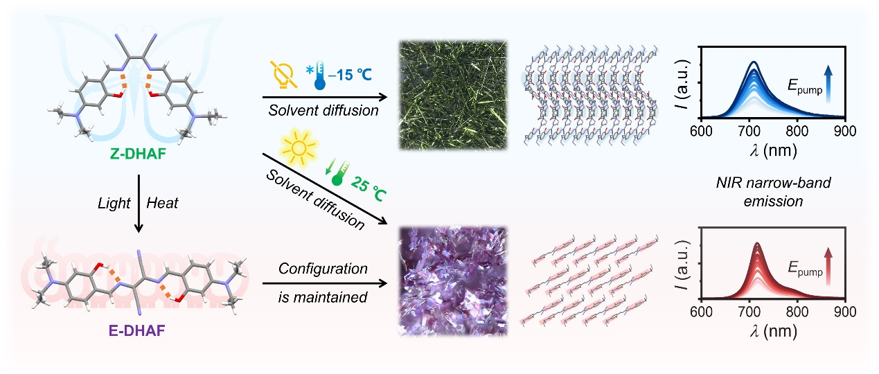 针对这一挑战,伟德国际victor1946张红雨教授团队与纽约大学Panče Naumov教授团队联合开展了研究,提出了一种基于异构化与晶体生长动力学协同调控的新策略。通过操纵二氨基马来腈衍生物的顺/反(Z/E)异构过程及结晶条件,实现了超窄带近红外发射晶体(715 nm)的可控制备。所获Z型晶体具有尺寸依赖的发射窄化效应,半峰宽可降至约40 nm (0.096 eV);E型晶体兼具超窄发射与高光稳定性,在长时间激光照射下仍保持性能稳定。团队从分子间相互作用和激子-振动耦合角度揭示了其物理化学机制。该研究为发展高性能有机近红外发光材料提供了新方法,并在光通信、生物成像和柔性光电器件等领域展现出应用潜力。