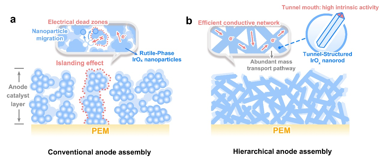 质子交换膜水电解(PEMWE)作为可再生能源制氢的重要技术路径,具备高电流密度、快动态响应等优势,已成为绿色氢能规模化应用的关键支撑。然而,该技术高度依赖贵金属铱基催化剂,传统金红石结构IrOx在工业条件下需2–4 mgIr cm⁻2的高负载以维持活性与耐久性,导致铱年需求量预计达1.5–2.0吨,占全球供应的约30%,资源瓶颈日益突出。尽管降低铱用量有助于缓解供需压力,但常规催化层在低载量下易发生结构破损、导电网络断裂及“孤岛效应”,进一步诱发活性衰减、颗粒迁移与气液传输障碍。因此,实现PEMWE的可持续发展亟需突破传统结构设计,通过原子尺度活性优化与器件尺度结构重构协同提升铱利用效率与电解性能。