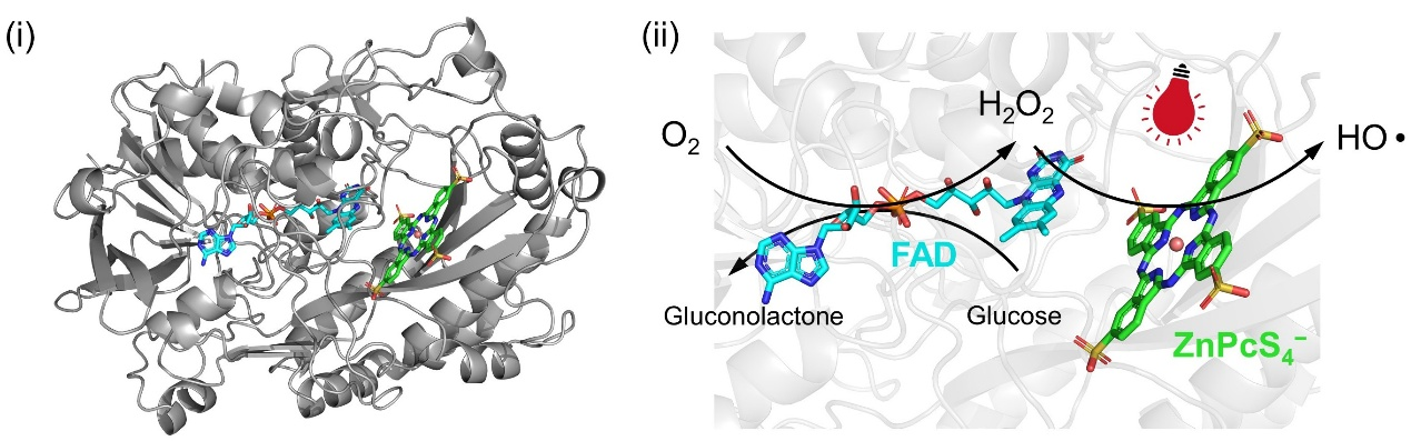 SNIRPE(Supramolecular NIR Photoenzyme)是一种由葡萄糖氧化酶(GOx)和四磺酸锌酞菁(ZnPcS4−)通过非共价作用自组装而成的超分子光酶系统。GOx的氨基酸残基(如Arg93、Arg333、Tyr66等)与近红外光催化剂ZnPcS4−的磺酸基和中心金属Zn存在多重非共价相互作用,这使得ZnPcS4−自发地自组装到GOx的空腔口。GOx对ZnPcS4−的限域作用,形成了内置的级联。其中,GOx除氧产生的H2O2可立即被ZnPcS4−光敏化为羟基自由基,然后可以引发可逆加成-断裂链转移(RAFT)聚合。