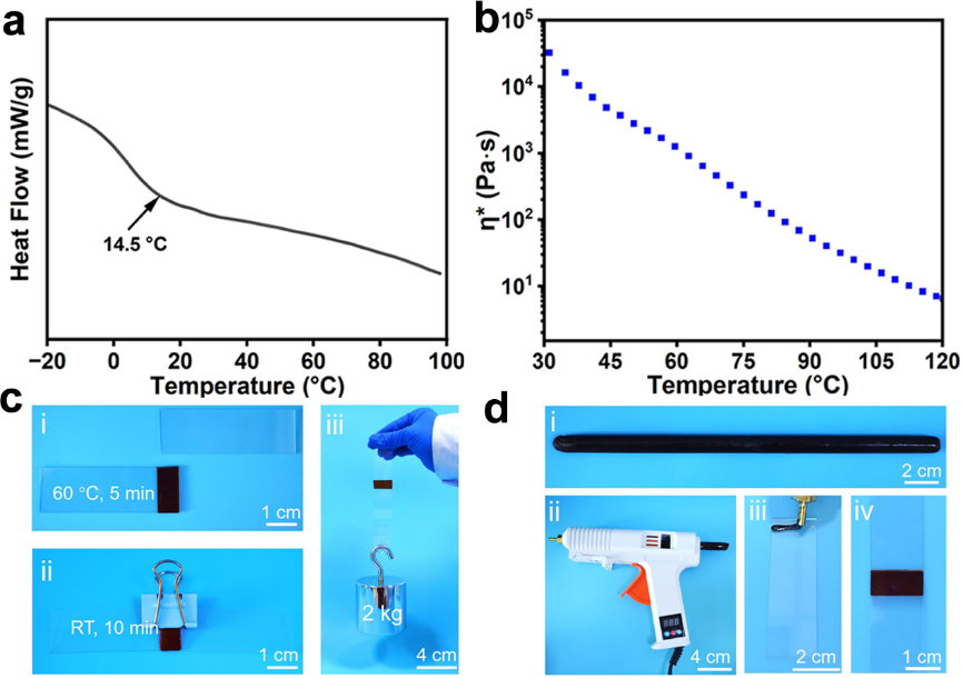 图2. a) ESO-Am粘合剂的DSC曲线。b) ESO-Am粘合剂复黏度随温度的变化曲线。c) ESO-Am作为胶带使用的粘合过程。d) ESO-Am作为热熔胶棒使用的粘合过程。