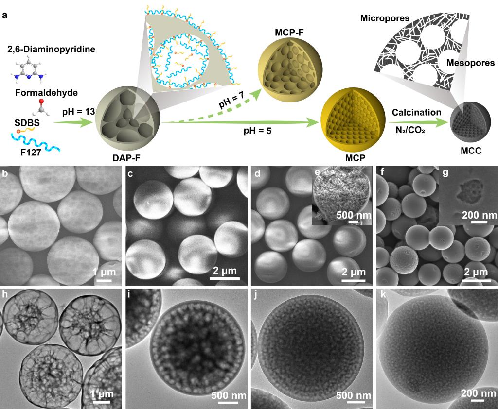 伟德国际victor1946乔振安教授课题组提出了一种表面活性剂诱导的限域聚合策略来合成具有精细结构的氮掺杂多腔室碳微球(MCC)。这种碳球的前驱体是一种基于2,6-二氨基吡啶(DAP)的新型多腔室聚合物(MCP)。如图1所示,一锅法合成MCP包含了两个聚合步骤。第一步在碱性溶液中DAP与甲醛生长成类细胞骨架结构的预聚物DAP-F。在聚合过程中聚合物表面活性剂F127和阴离子表面活性剂十二烷基苯磺酸钠形成双表面活性剂体系来控制DAP-F预聚物的生长。其中,F127用作空间稳定剂来防止DAP-F颗粒团聚。DAP分子中的氨基集团可以降低阴离子表面活性剂负电基团的静电排斥,导致表面活性剂排列成囊泡来减少端基基团的裸露面积,从而导致DAP-F中大空腔的形成。加入乙酸后开始第二阶段的聚合,随着溶液pH的降低,DAP-F预聚物发生进一步交联,其在微球限域空间中的聚合导致大腔室空间分隔形成丰富的小腔室。