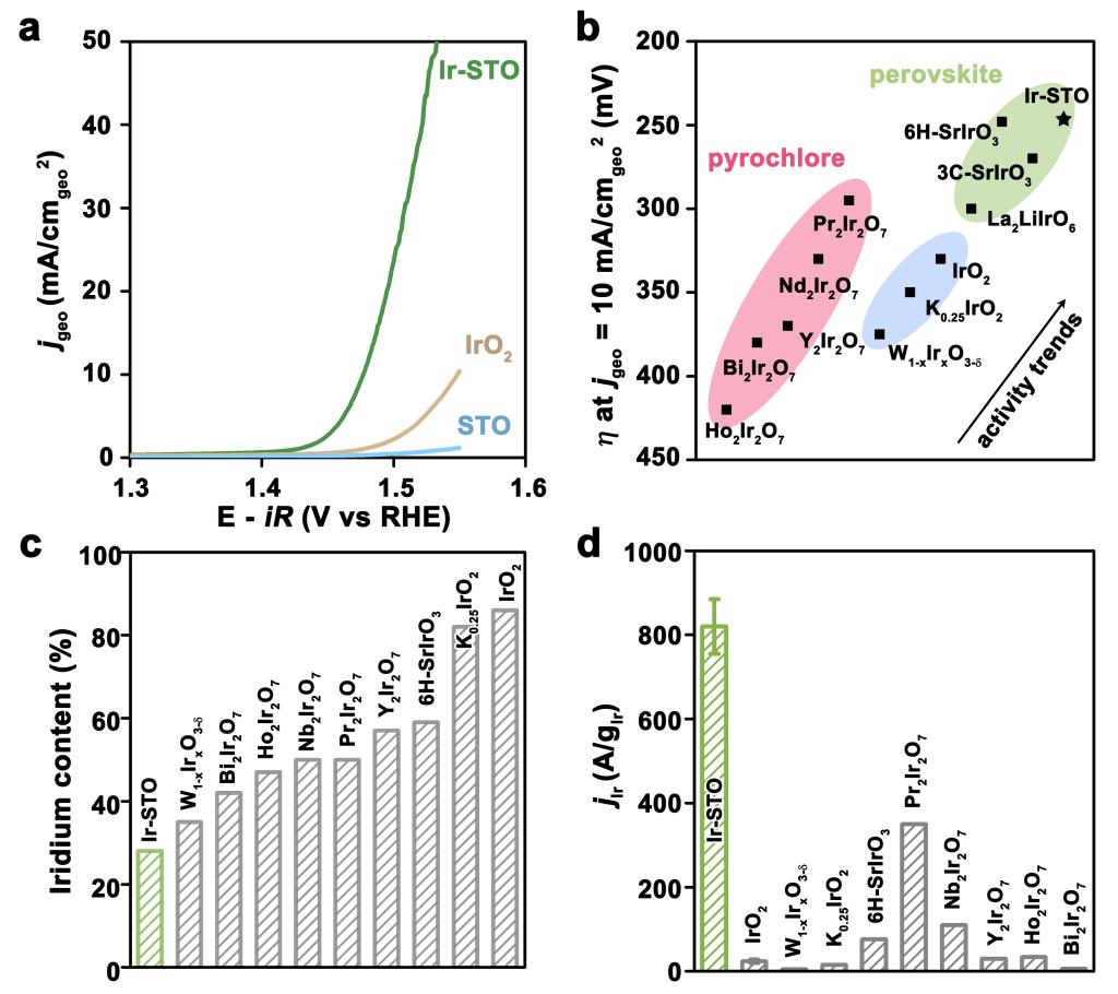 近年来,无机合成与制备化学国家重点实验室邹晓新课题组一直致力于研究低成本、高活性的酸性水氧化催化剂。2018年,该课题组与合作者报道了首例含金属-金属键亚结构的酸性水氧化催化剂(6H-SrIrO3)。该催化剂与IrO2相比,铱用量减少了27%,铱质量活性达到了IrO2的7倍(Nat. Commun., 2018, 9, 5236)。